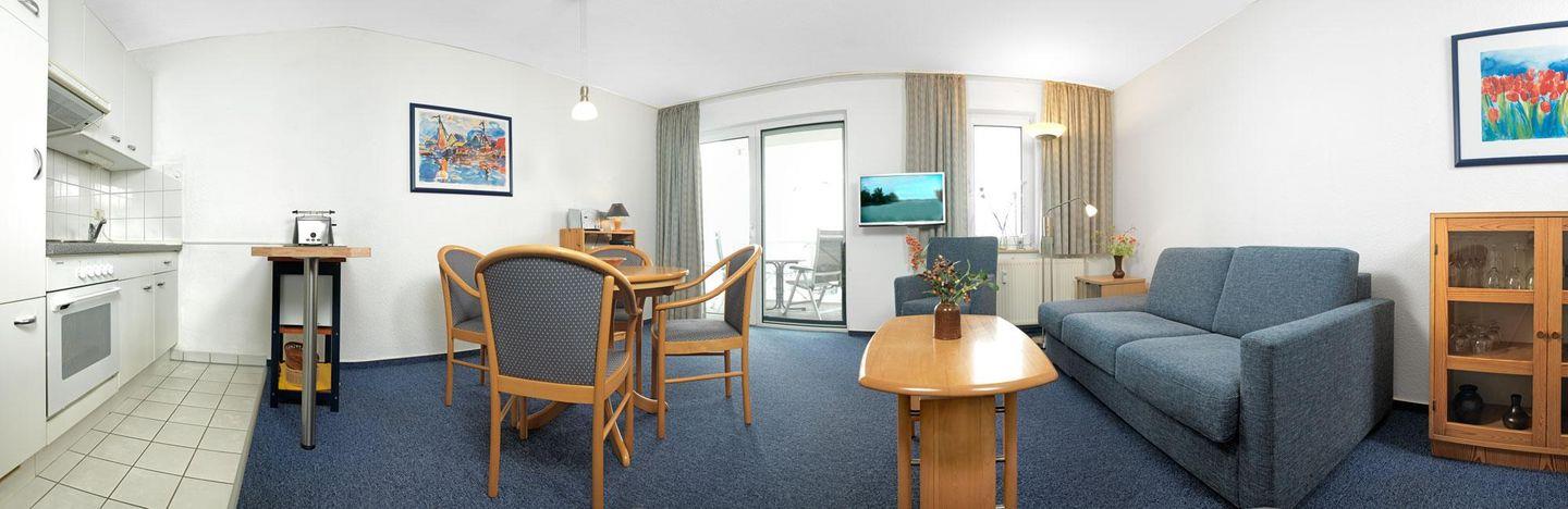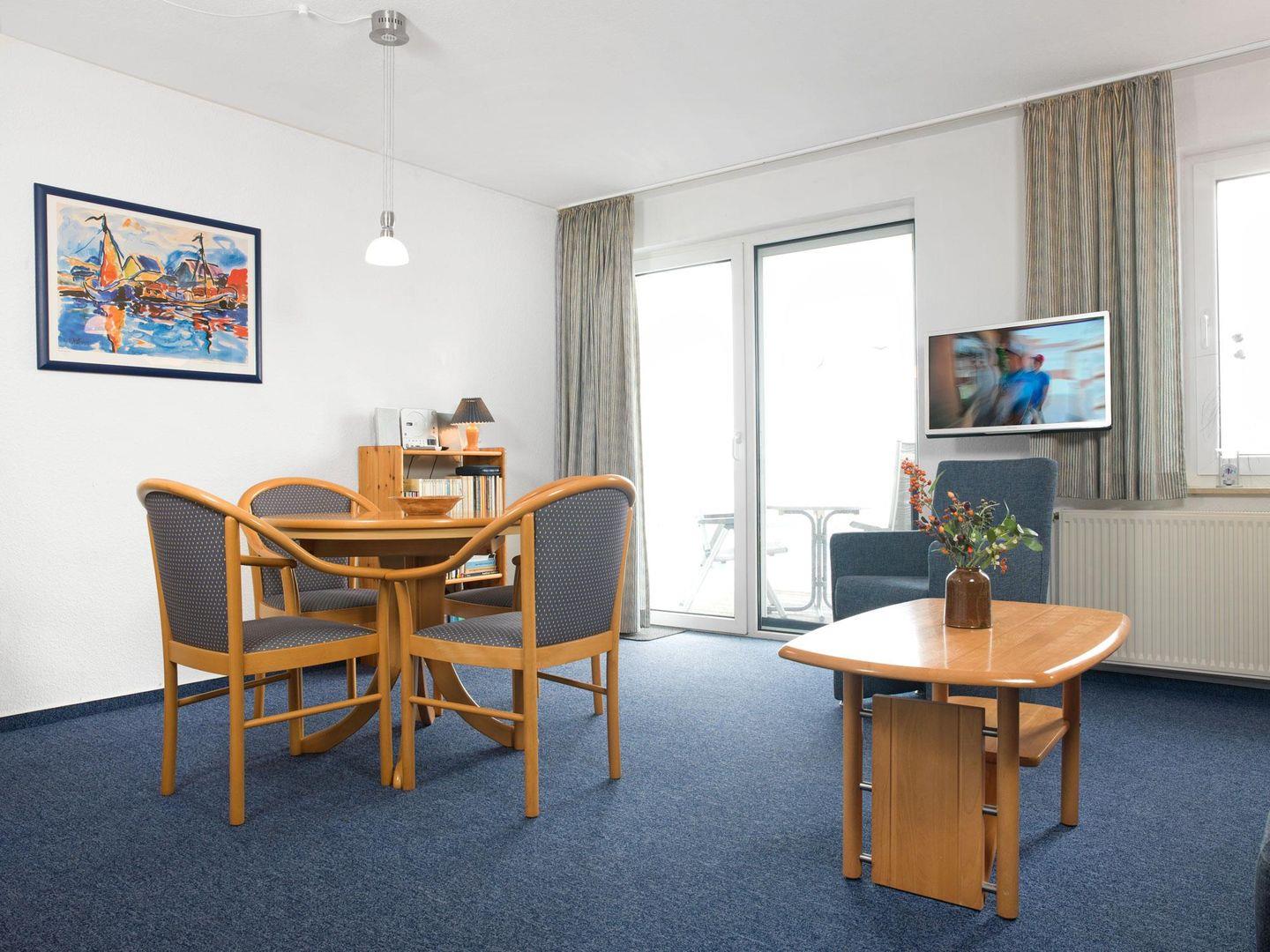 Vom gemütlich ausgestatteten Wohnzimmer gelangen Sie auf den schönen Süd-Balkon.