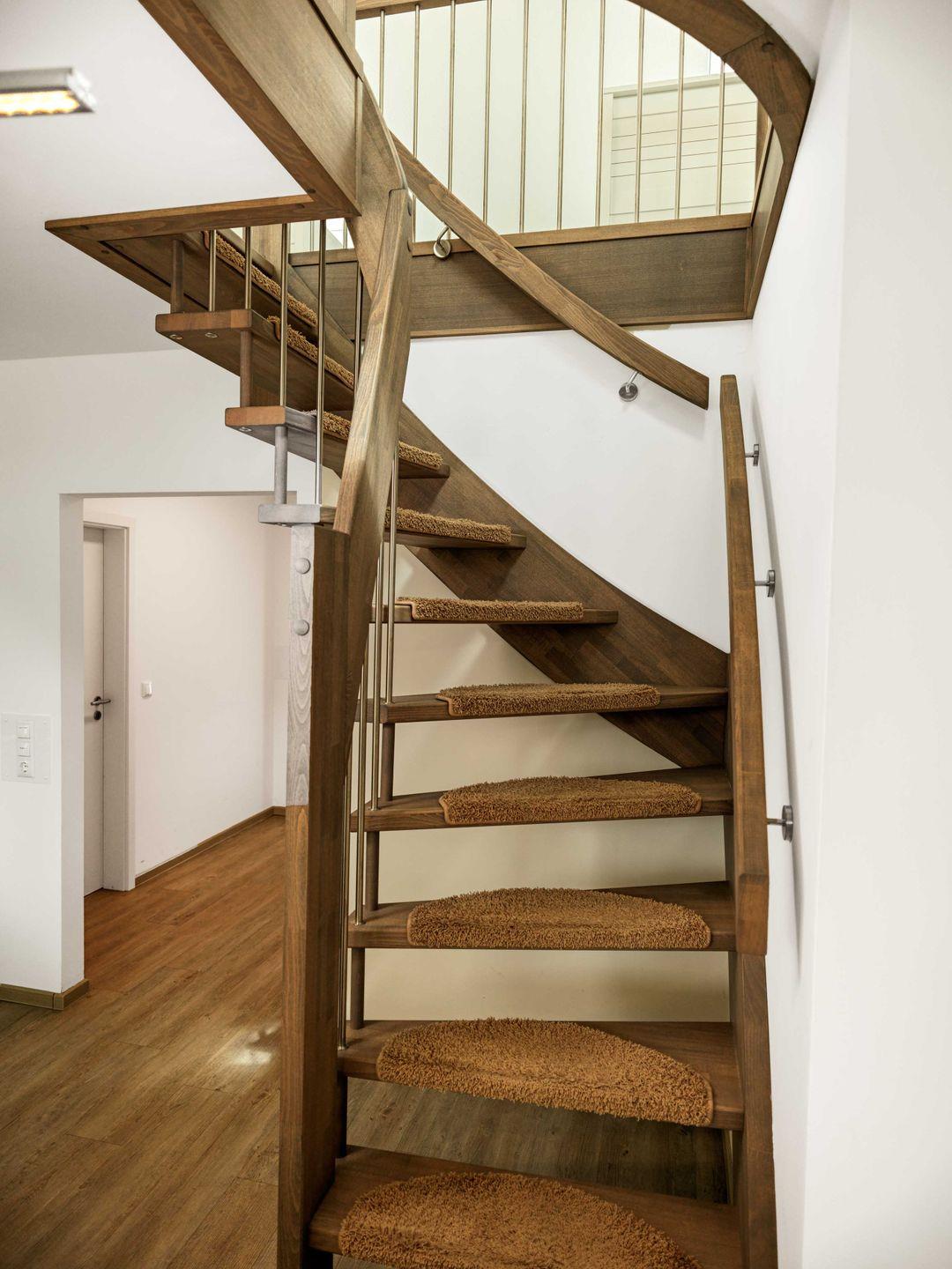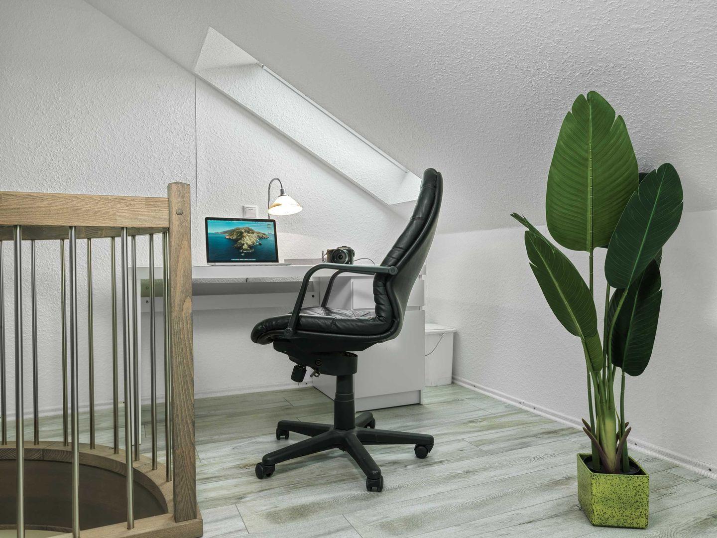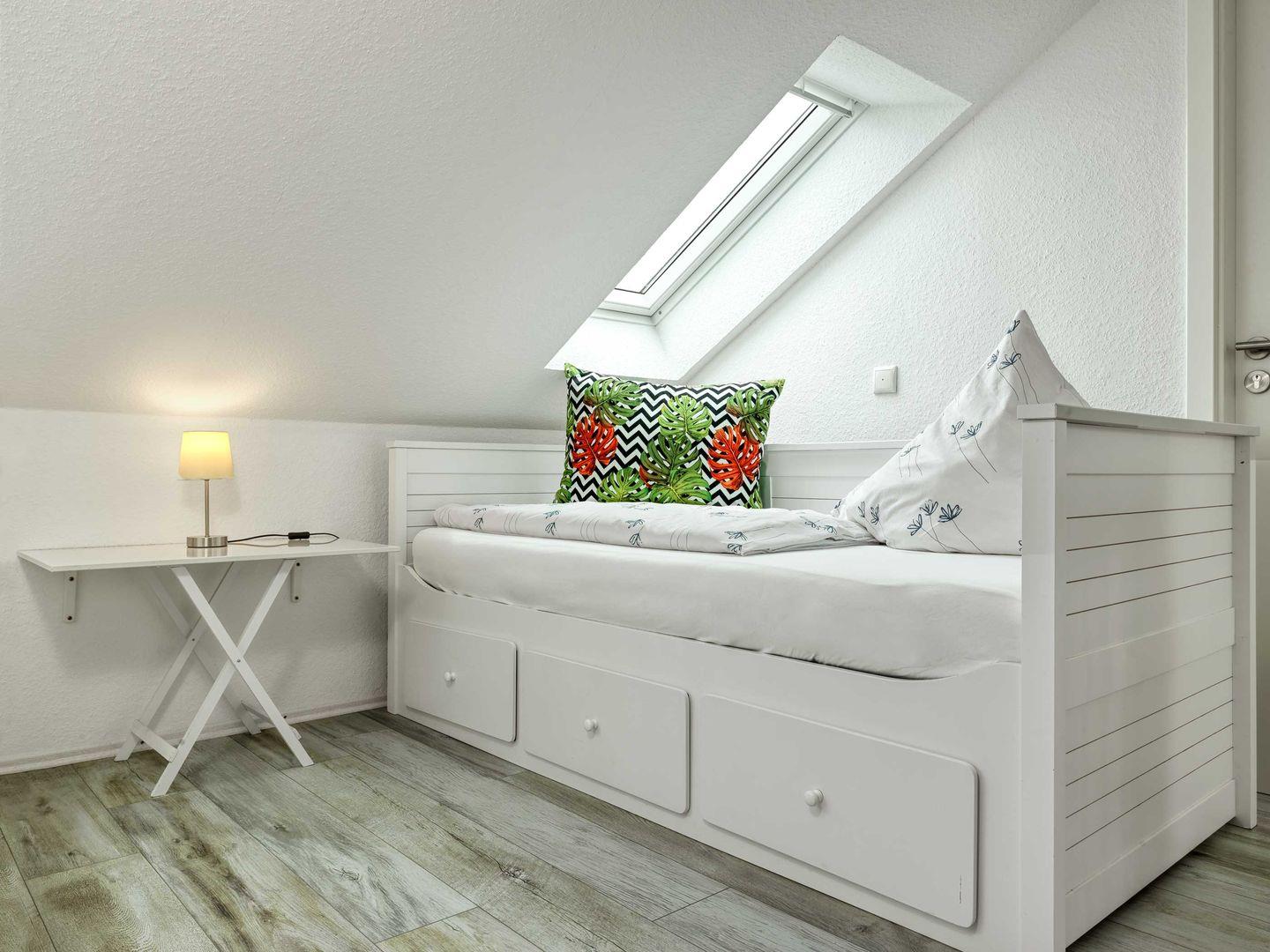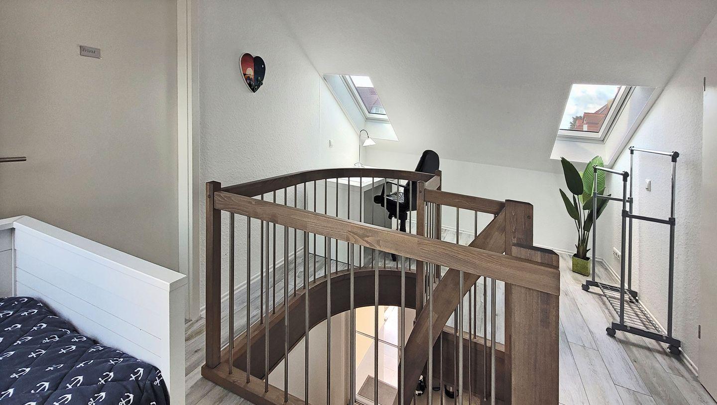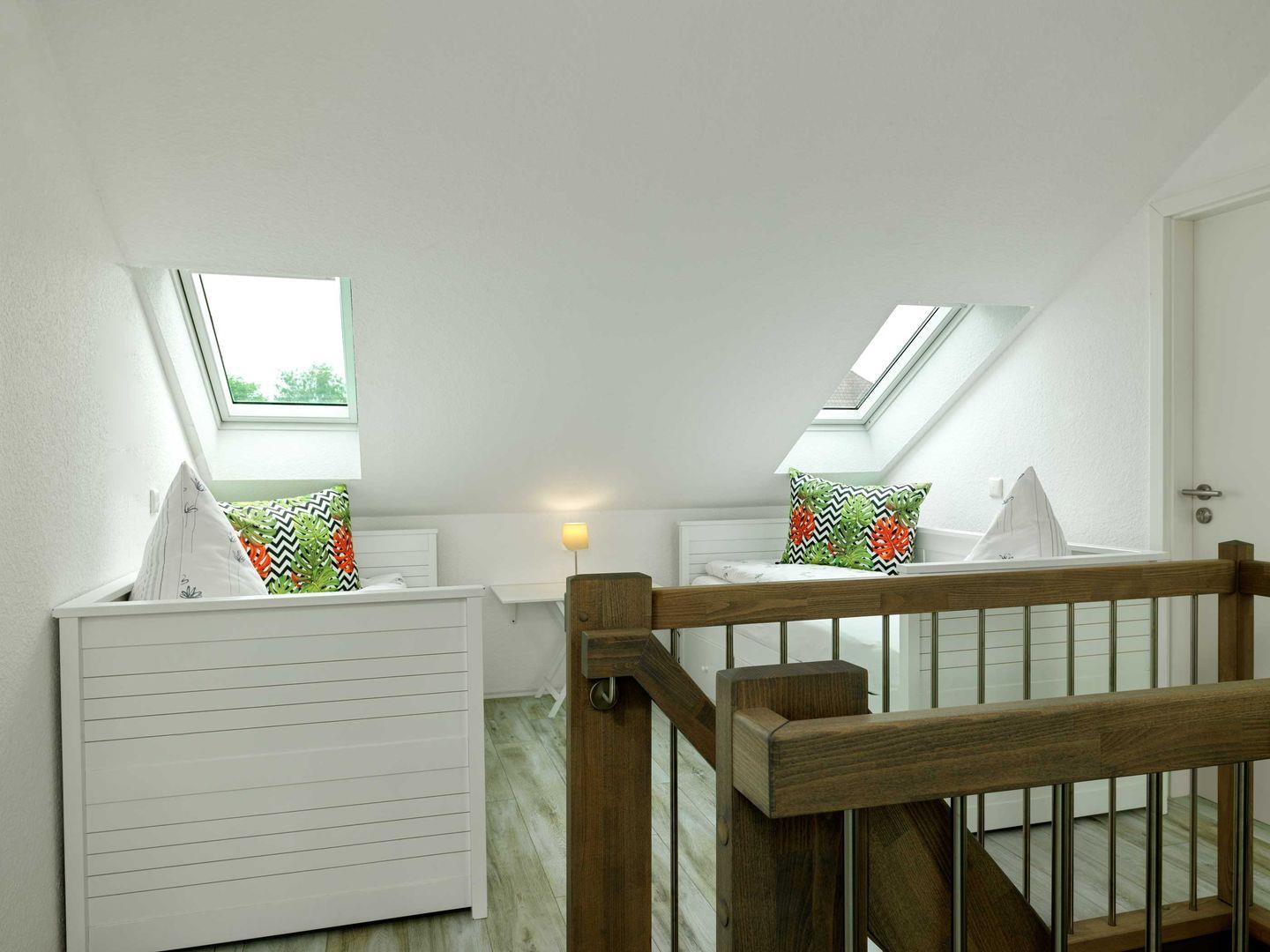 Ein Schlafzimmer ist mit Doppelbett und Kleiderschrank ausgestattet. Ein weiteres Schlafzimmer, welches über eine kleine Wendeltreppe im DG erreichbar ist, ist mit zwei Einzelbetten ausgestattet. Das zweite Schlafzimmer ist offen zum Wohnraum.