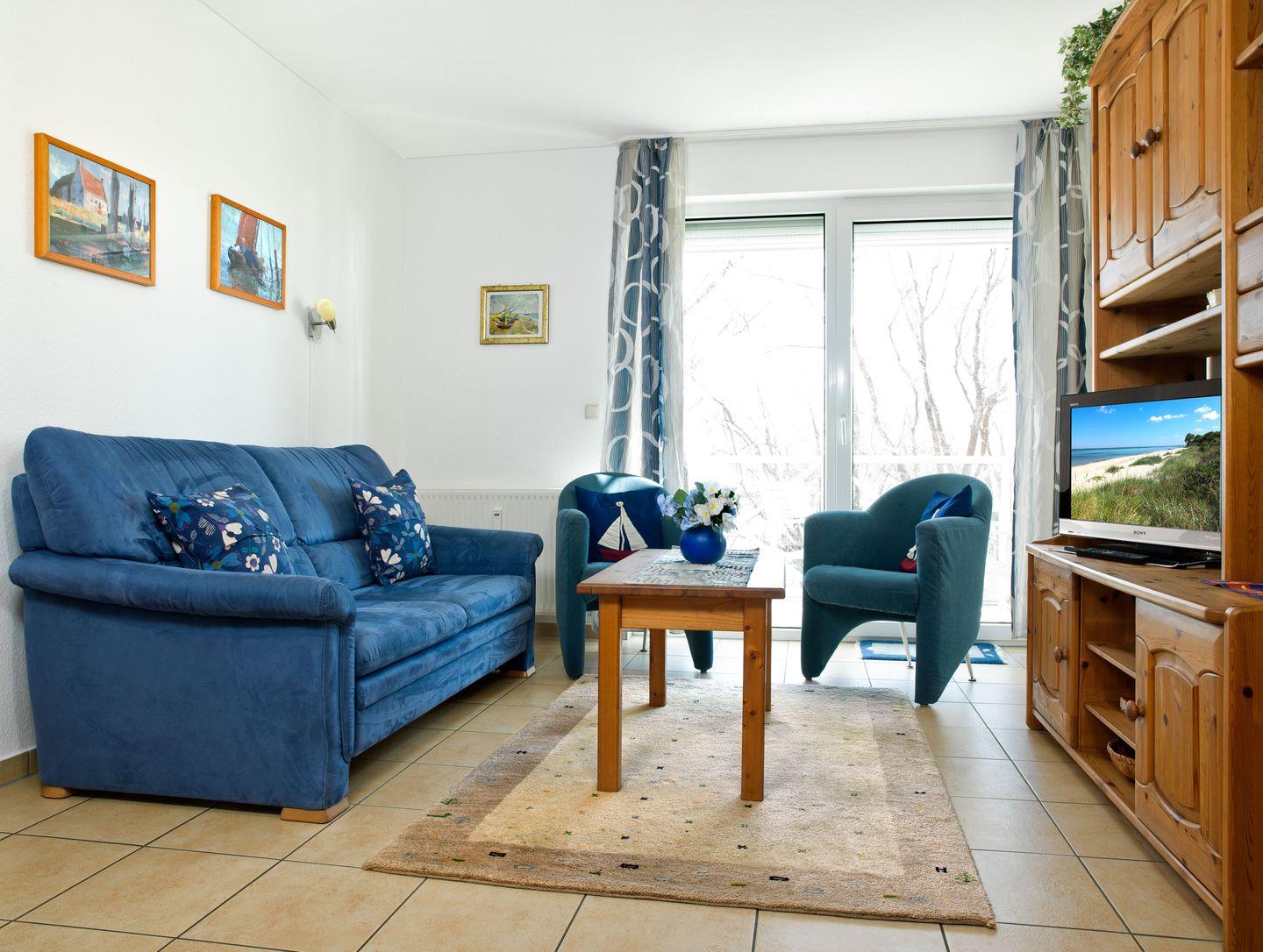 Vom gut ausgestatteten Wohnzimmer mit Flach-TV und Sofaecke, gelangen Sie auf den Balkon.