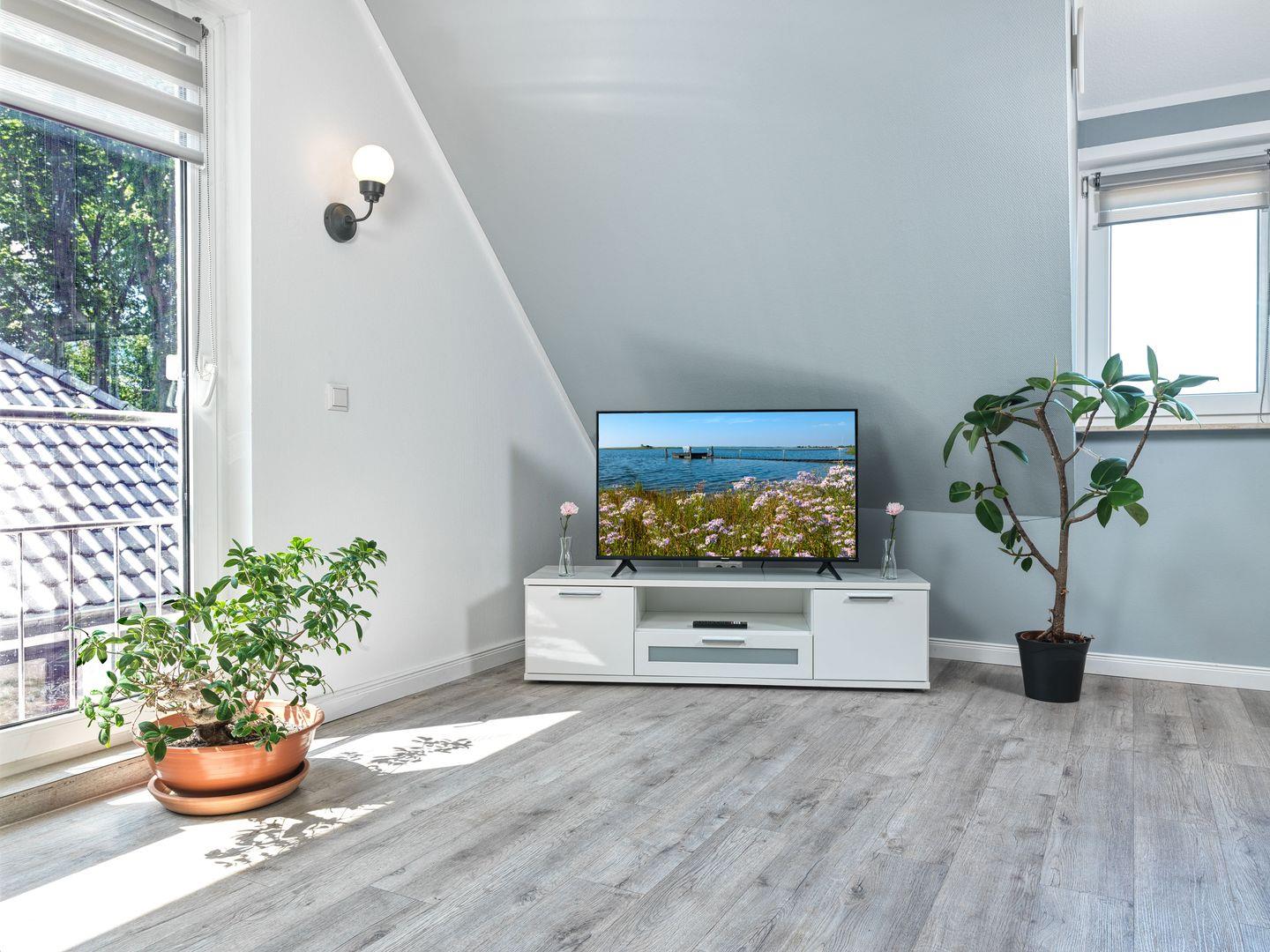 Das gemütliche, helle Wohnzimmer ist mit Flat TV, Sofaecke und Kamin ausgestattet.