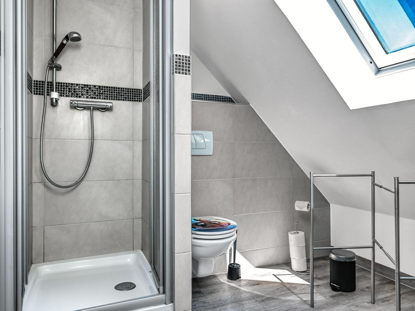 Das Bad ist mit Dusche/WC, Spiegelschrank, Waschtisch und Föhn ausgestattet.