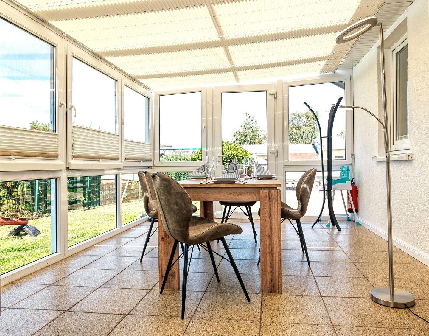 Der große Wintergarten mit schönem Essplatz bietet Ihnen den Blick ins Grüne Die anschließende Küche mit Mikrowelle, Herd/Backofen, Kühlschrank und vielem mehr macht Ihren Urlaub zu etwas Besonderem.