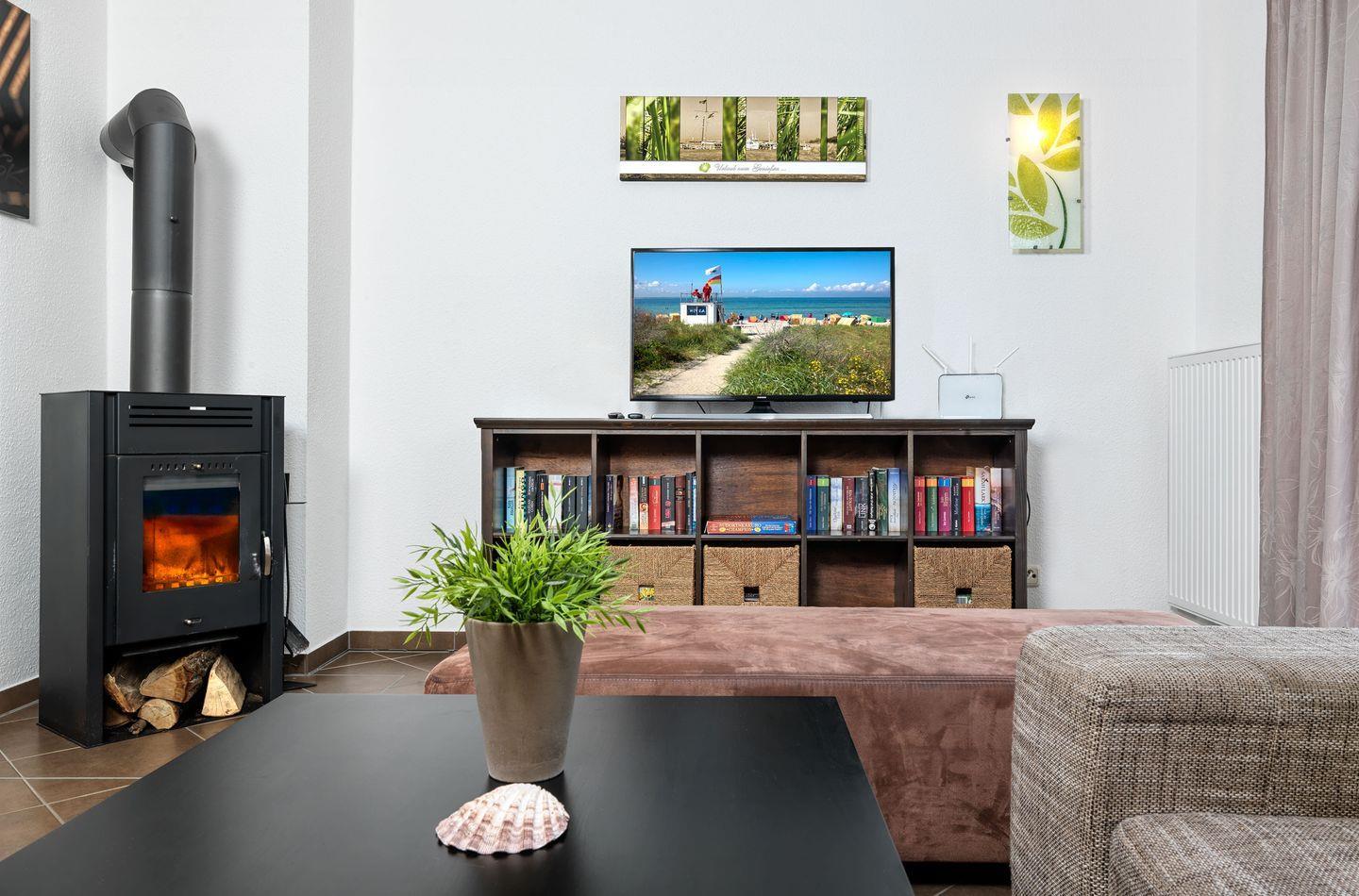 Vom Wohnzimmer (ausgestattet mit einem SMART-TV) aus haben Sie direkten Zugang zur Terrasse mit Gartenmöbeln, um die Poeler Sonne zu genießen.