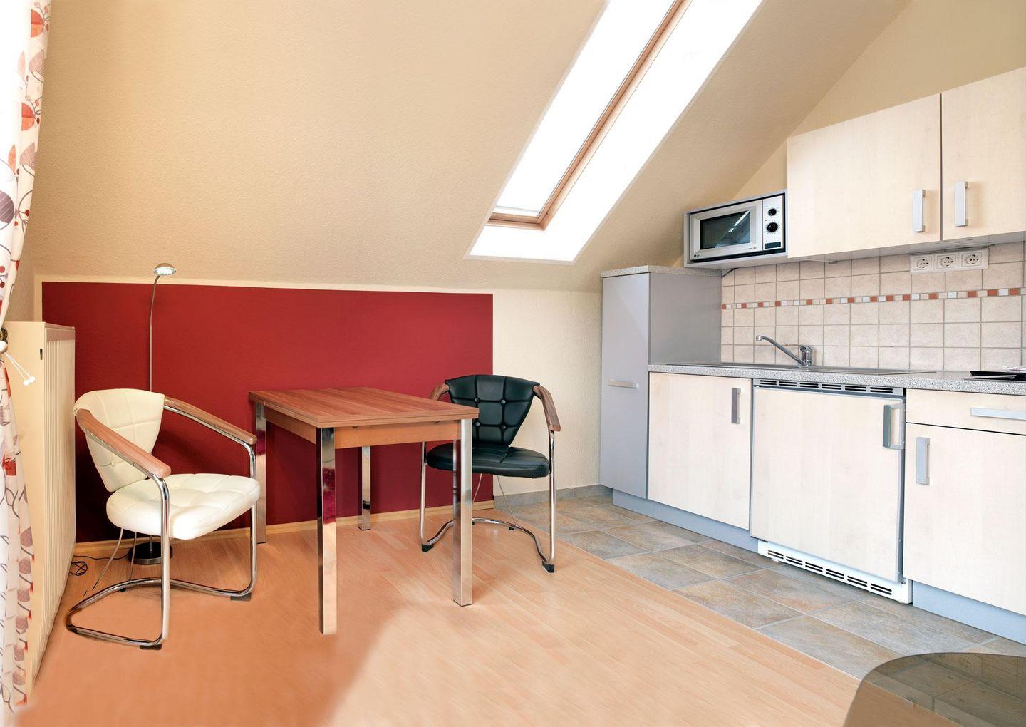 Die Küchenzeile verfügt über eine Mikrowelle, Kühlschrank mit Gefrierfach, Kaffeemaschine, Toaster und Wasserkocher.