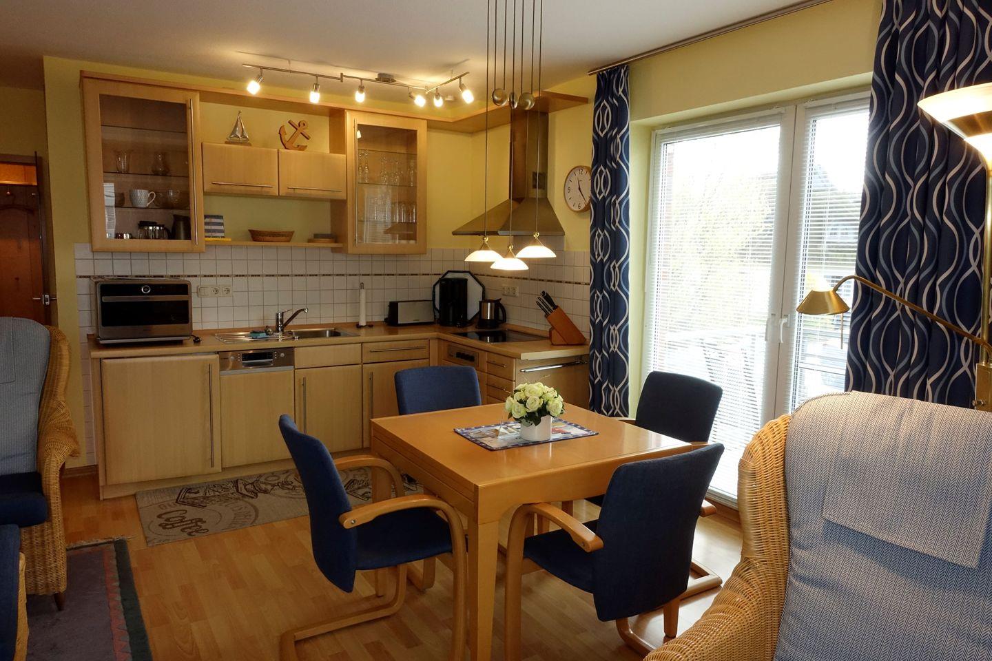 Ein großzügiges Schlafzimmer, ein schönes Duschbad und das charmante, große, helle Wohnzimmer mit offener Küche sind ein Garant für entspannte Ferientage.
