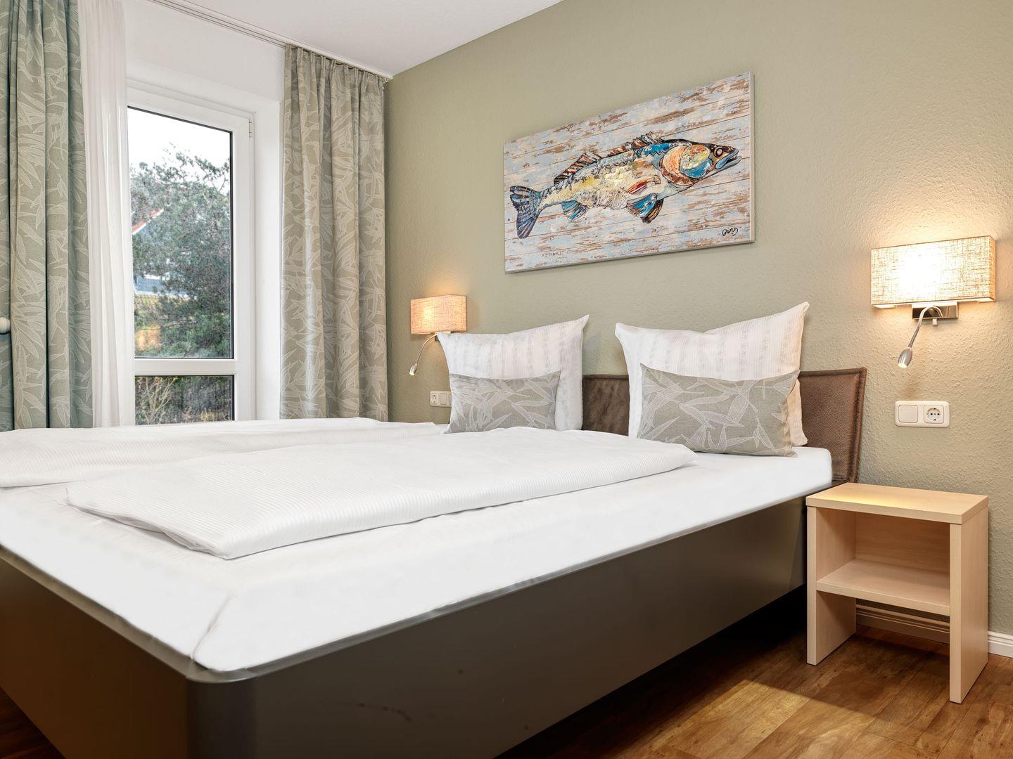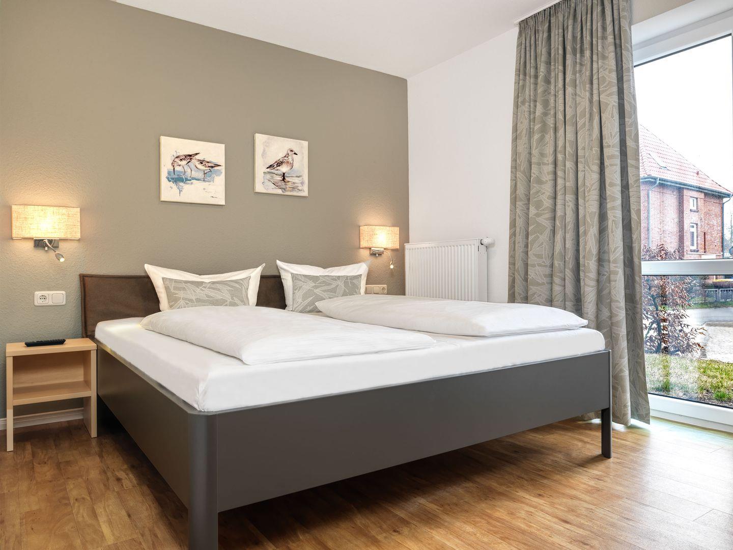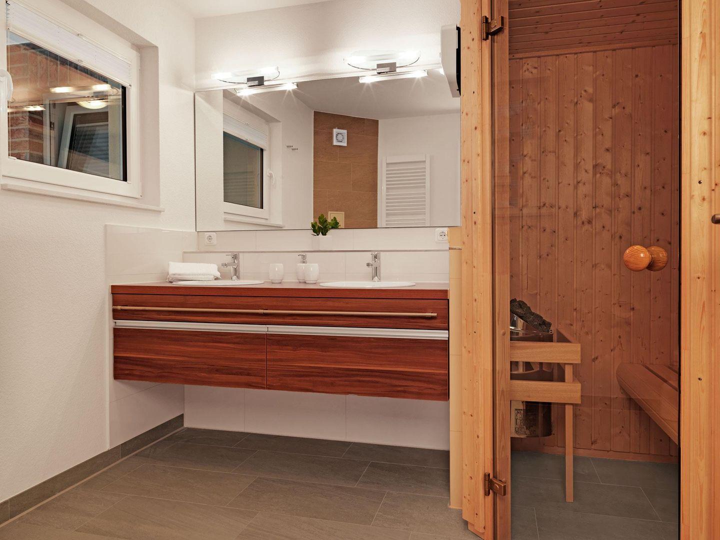 Zwei geräumige Schlafzimmer mit Doppelbetten sowie ein großzügiges Bad mit Sauna und ein Gäste WC lassen bis zu 6 Personen einen entspannten Urlaub verleben.