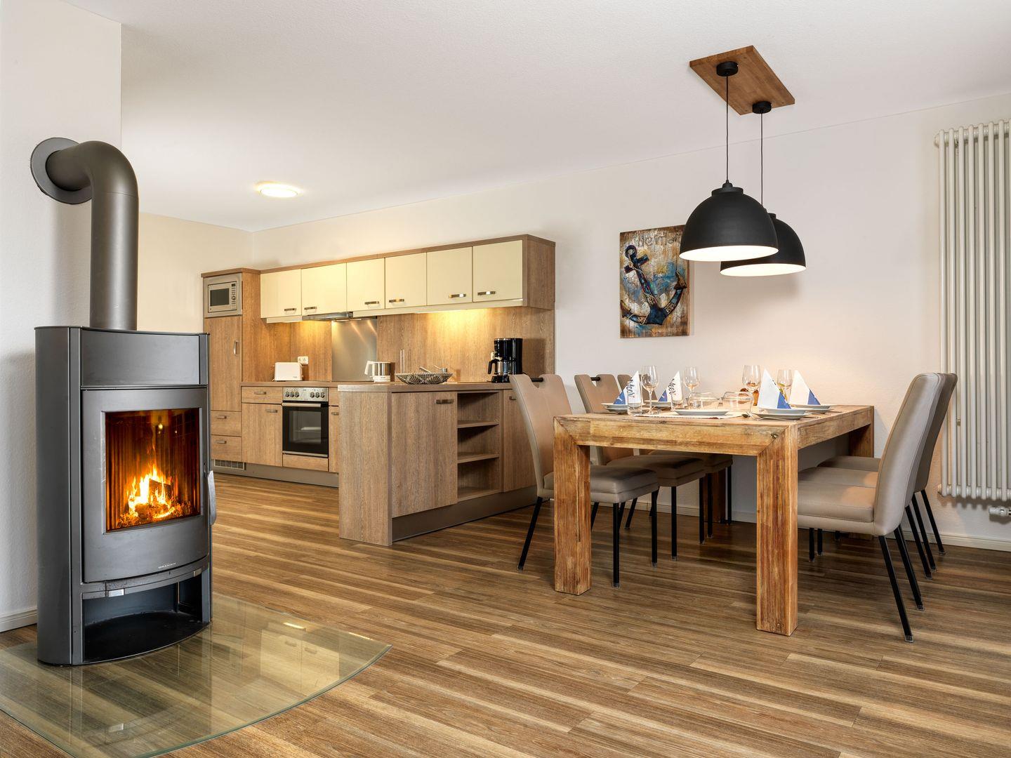 Ein großes Wohnzimmer mit offener Küche, Kaminofen, Schlafcouch erwarten Sie.