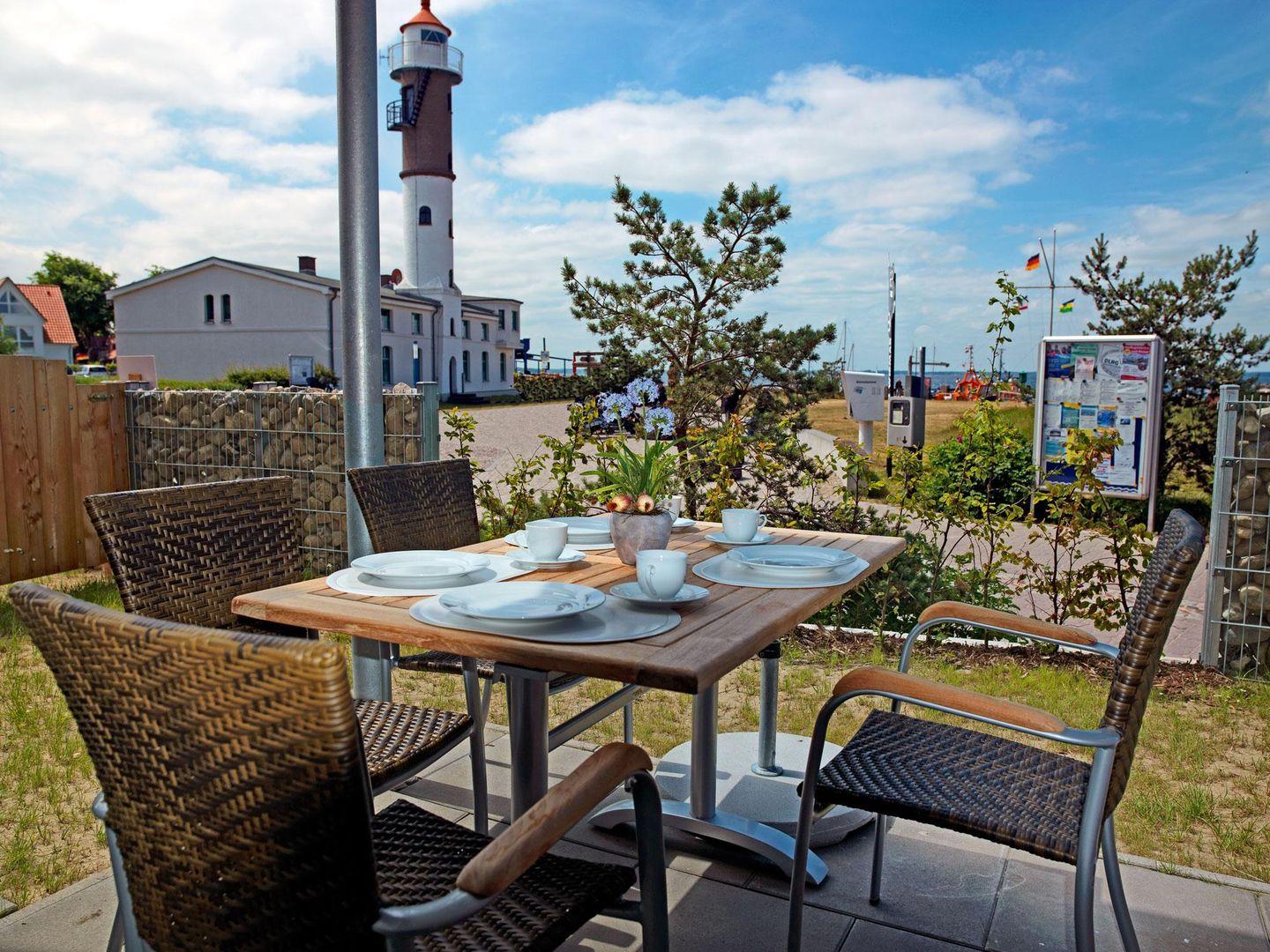 Die Terrasse mit Wasserblick, schönen Terrassenmöbeln sowie einem Strandkorb lädt zu gemütlichen Stunden ein!