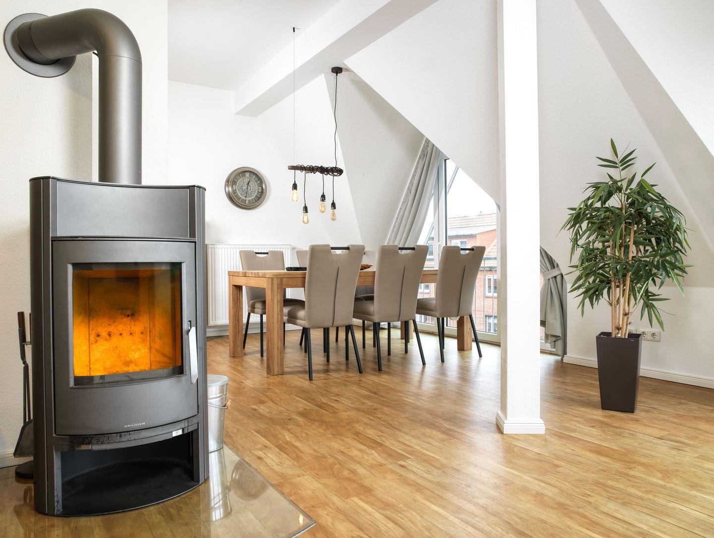 Ein großes Wohnzimmer mit offener Küche, Kaminofen, Schlafcouch sowie einem Balkon, der zum Hafen ausgerichtet ist erwarten Sie!