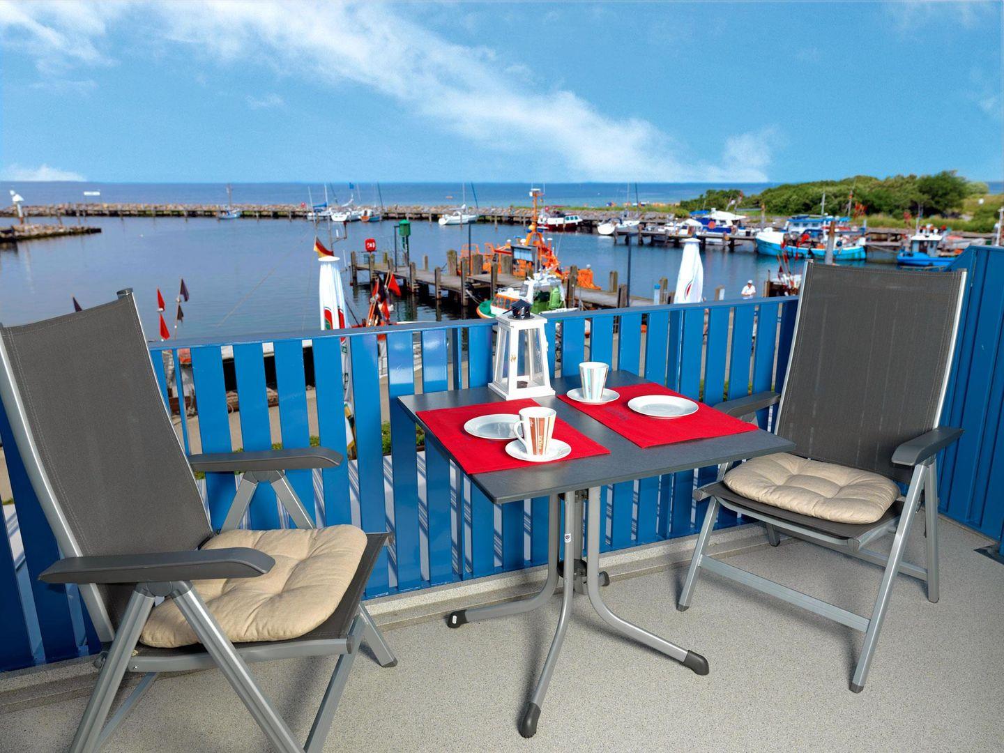 Genießen Sie den freien Blick auf den Hafen von Timmendorf, traumhafte Sonnenuntergänge und das Meer vom schönen Balkon oder von der Couch.