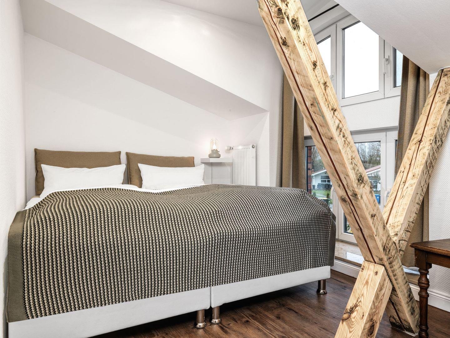 Das Schlafzimmer mit einem Doppelbett (180x200 / Boxspringbett mit 2 einzelnen Toppern) ist super gemütlich, mit den freiliegenden Balken und Dachschrägen eingerichtet und ideal für 1-2 Erwachsene.