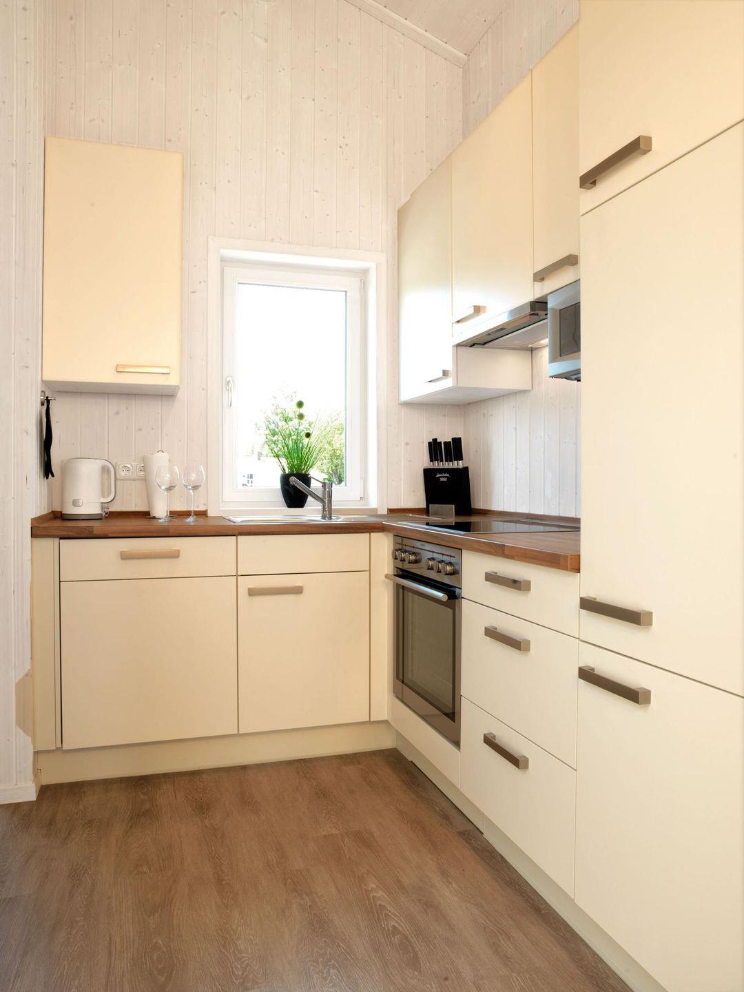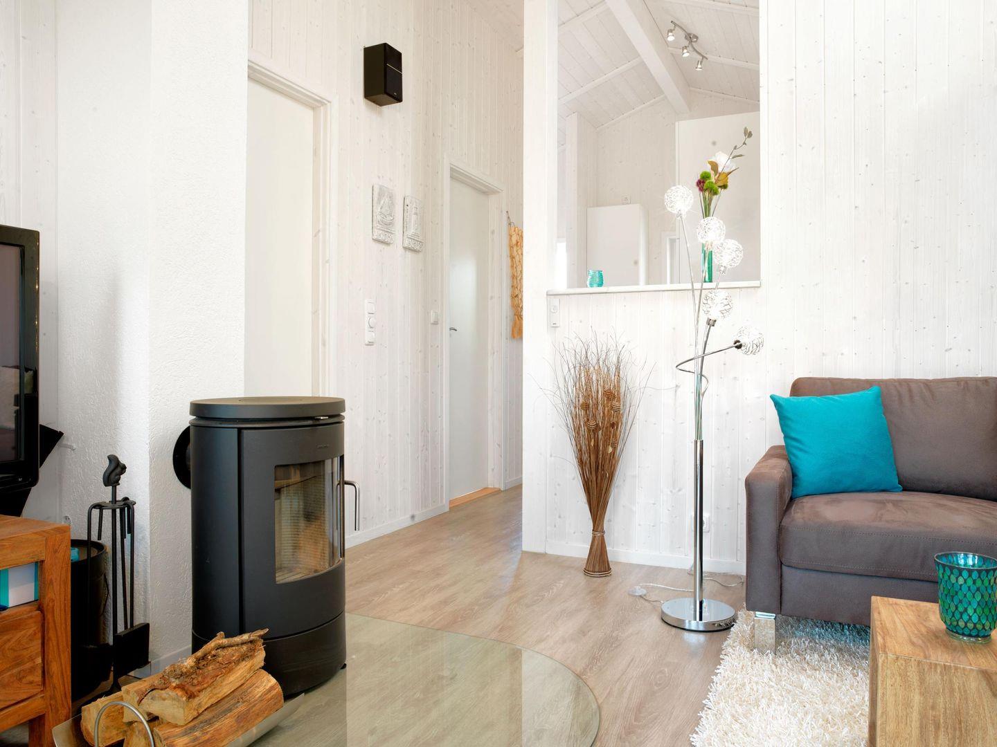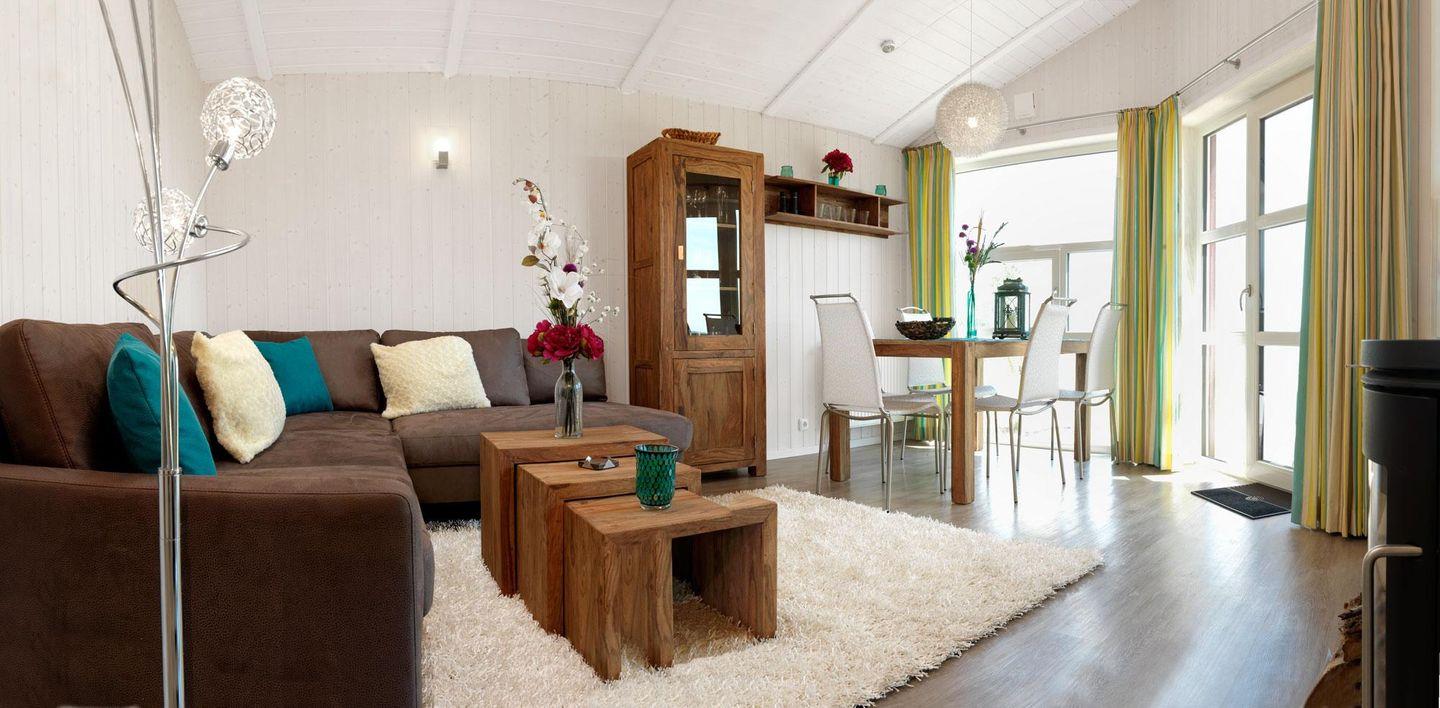 Das helle, gemütliche Wohnzimmer mit hübschen, modernen Möbeln und vollwertigem Schlafsofa lässt keine Wünsche offen. Kostenloser W-Lan-Anschluß vorhanden. Ein Flat-TV mit DVD-Player sowie ein CD-Spieler und ein MP3-Player stehen für weitere Zerstreuung zur Verfügung. Der Kaminofen sorgt für heimelige Wärme. Ein Esstisch für 5 Personen direkt am Panoramafenster mit Blick in die Natur steht Ihnen zur Verfügung. Vom Wohnzimmer aus gelangen Sie auf die Terrasse, die mit Terrassenmöbeln und zwei Liegen ausgestattet ist. 2 schöne Schlafzimmer, eins mit Doppelbett, eins mit Etagenbett (untere Liegefläche 140x200) erwarten Sie. Die offene Küche im Eingangsbereich bietet Ihnen allen Komfort, den Sie für einen gelungenen Urlaub brauchen. Ein Gäste WC mit Dusche sowie das große Bad mit Sauna und Whirlpool, sowie einer weiteren Duschkabine und einem WC runden die perfekte Ausstattung ab. Die Fenster im Wohnzimmer und Schlafzimmer sind mit Insektenschutz ausgestattet.