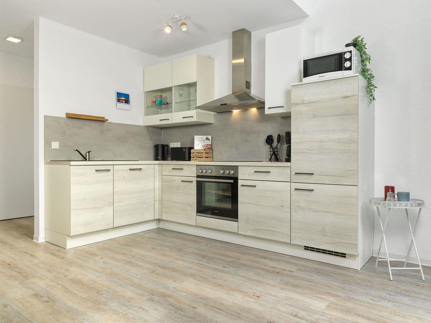 Das Haus besticht durch ein offenes Wohnkonzept, ein Wohnbereich mit einem großem Fernseher und gemütlicher Eckbank/Sitzgruppe sowie offener Küche mit direktem Zugang zur Terrasse. Die Küche ist mit modernen Geräten wie Herd, Backofen, Geschirrspüler und Kühlschrank ausgestattet – hier wird das Kochen zum Vergnügen!
