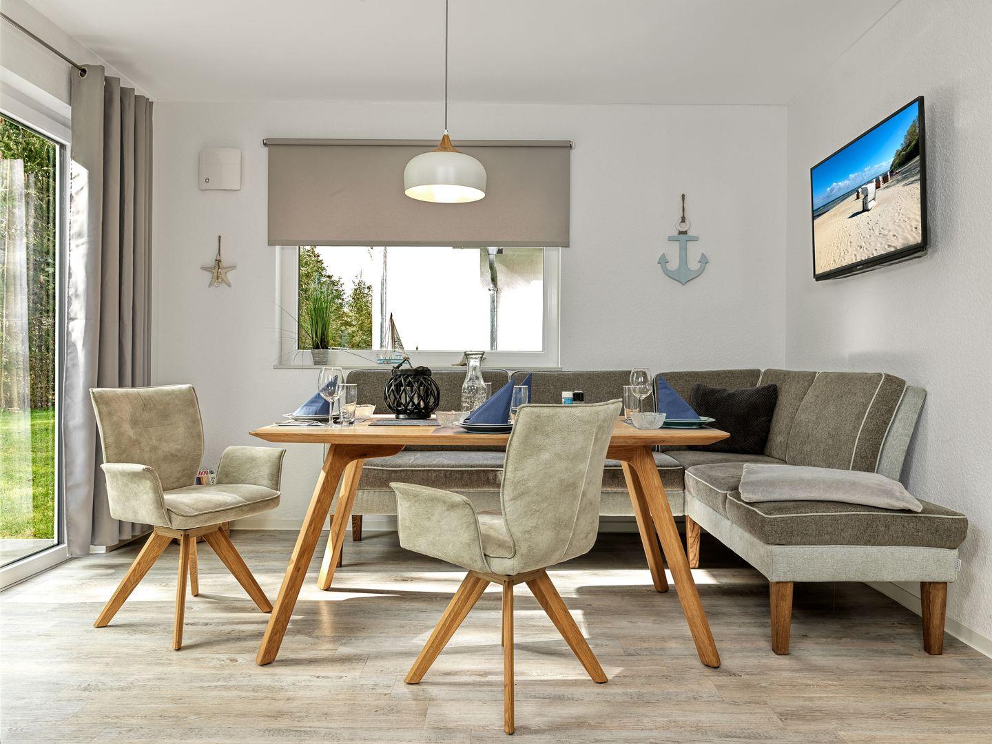 Das Haus besticht durch ein offenes Wohnkonzept, ein Wohnbereich mit einem großem Fernseher und gemütlicher Eckbank/Sitzgruppe sowie offener Küche mit direktem Zugang zur Terrasse. Die Küche ist mit modernen Geräten wie Herd, Backofen, Geschirrspüler und Kühlschrank ausgestattet – hier wird das Kochen zum Vergnügen!