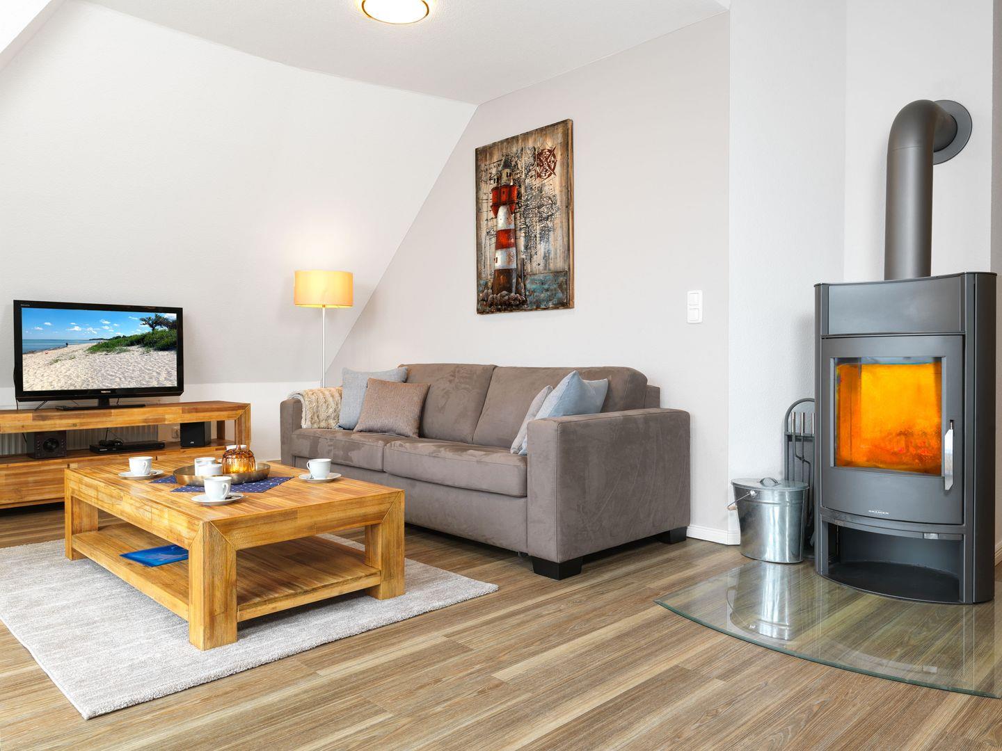 Ein großes Wohnzimmer mit offener Küche, Kaminofen sowie einem Balkon, der zum Hafen ausgerichtet ist, erwarten Sie!