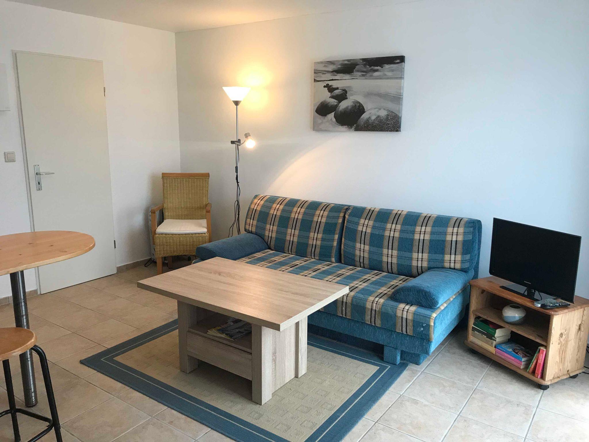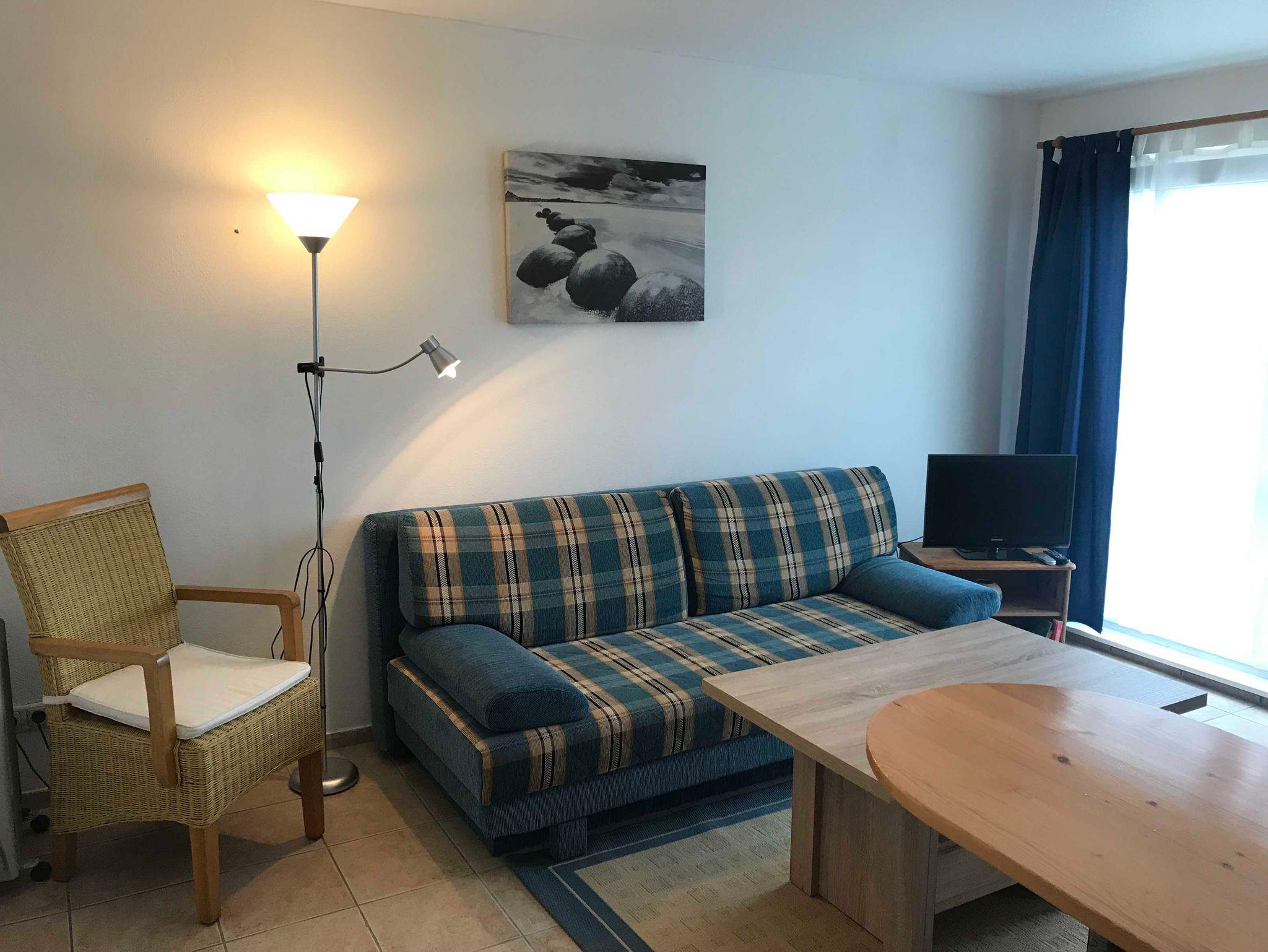 • Wohnzimmer mit Esstresen u. Singleküche, Couch, TV