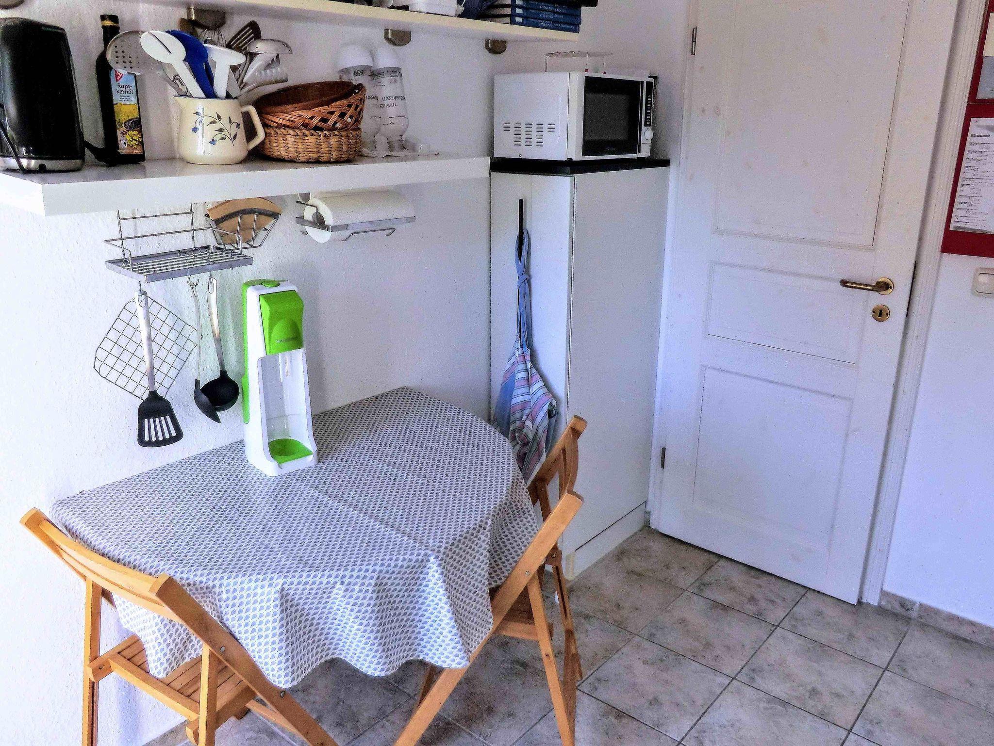 • separate Küche mit Tisch (2 Personen), 4- Plattenherd mit Backofen, Kühlschrank mit Gefrierfach, Mikrowelle, Toaster, Kaffeemaschine, alle Küchengeräte, umfangreiches Geschirr und Gläser