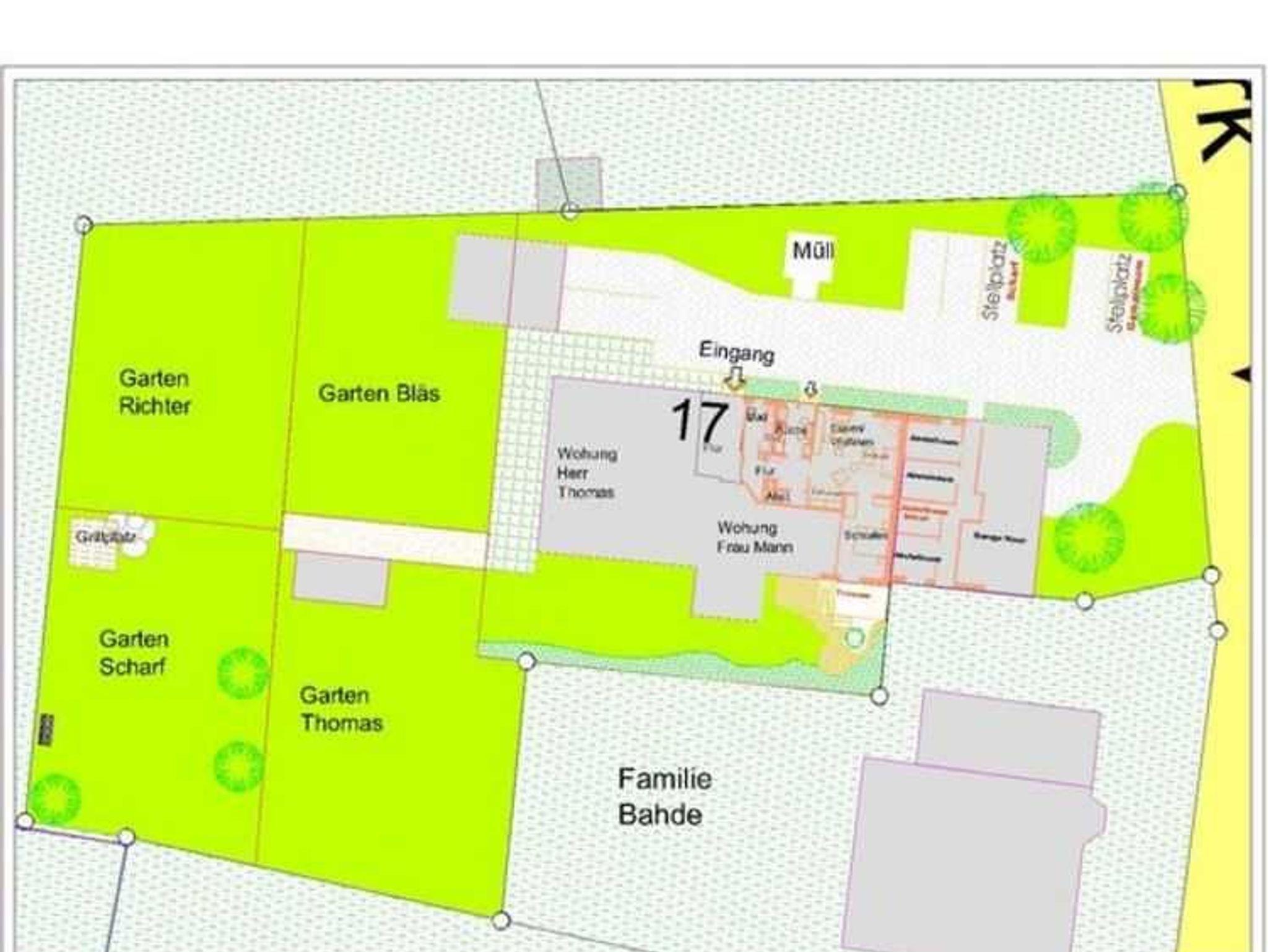 • der Garten vor der Wohnung ist an der Grundstücksgrenze mit dichten Sträuchern und Büschen abgegrenzt