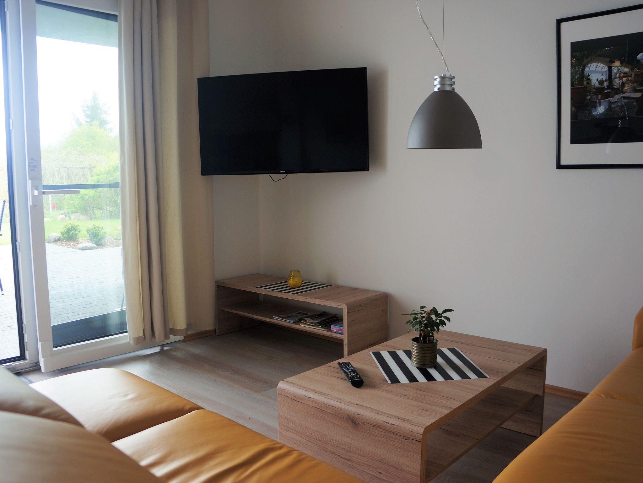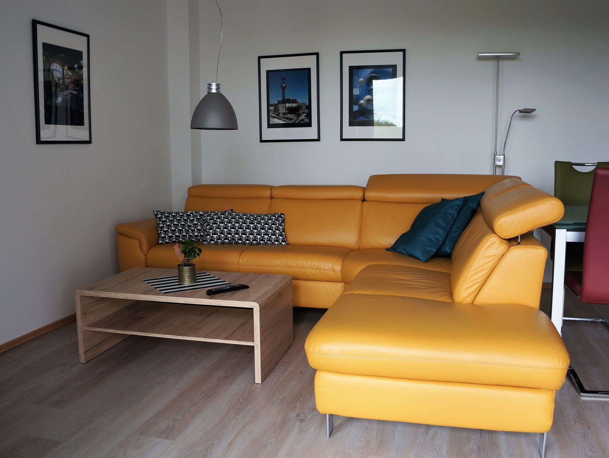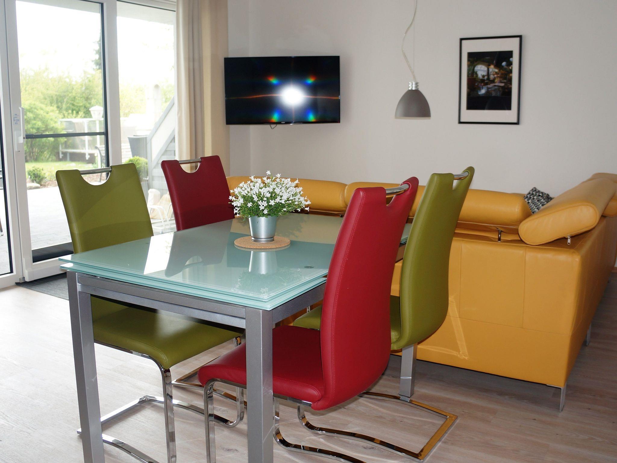 Der Wohnraum hat eine offene Küche, Esstisch, Flachbildfernseher, Sitzecke großem Ecksofa.