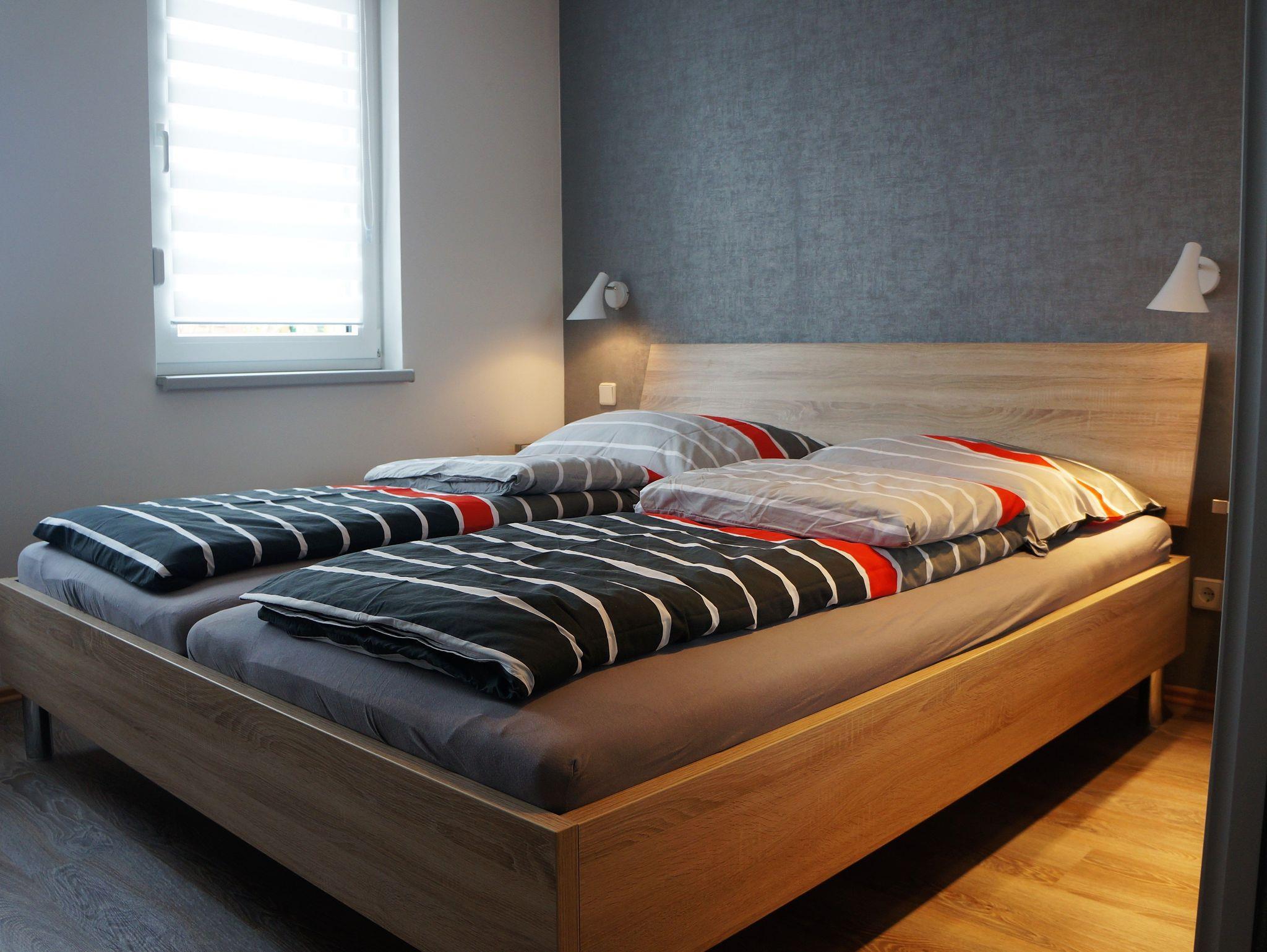 Zwei Schlafzimmer: ein Schlafzimmer mit Doppelbett, ein Schlafzimmer mit zwei Einzelbetten, sowie ein weiterer Flachbildfernseher.