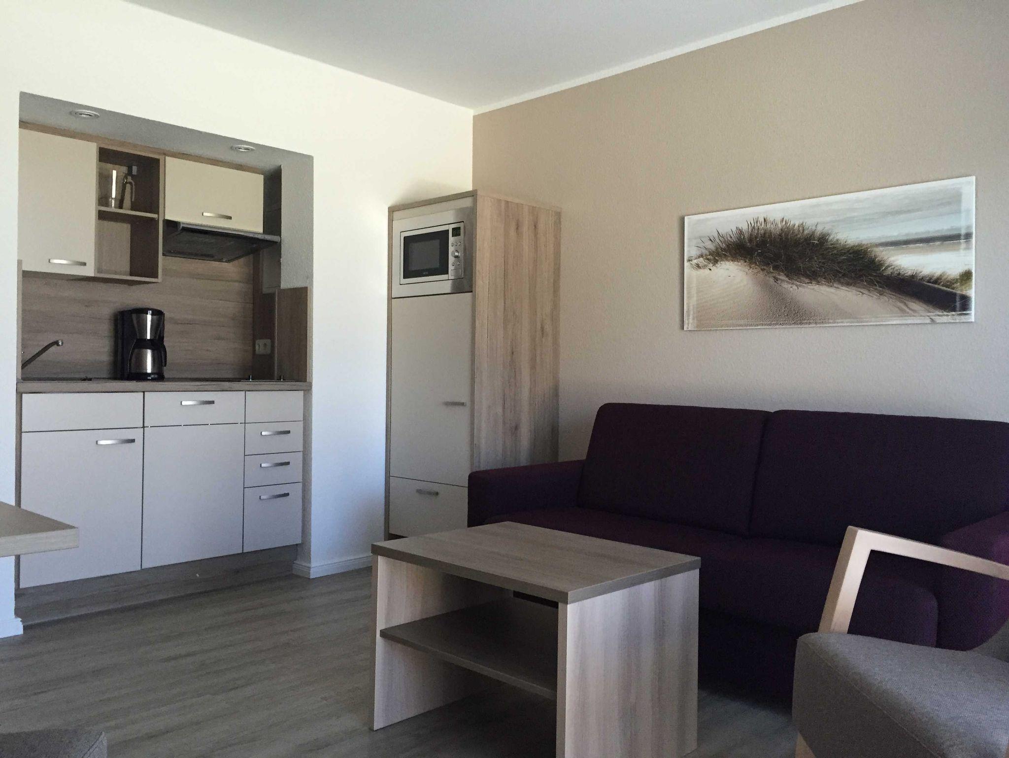 Im Wohnzimmer befindet sich eine offene Küche ausgestattet mit einem 2 Platten- Cerankochfeld, Geschirrspüler, Kühlschrank, Mikrowelle, Kaffeemaschine, Wasserkocher und Toaster. Sollten unsere Gäste getrennt schlafen, dient im Wohnzimmer eine ausklappbare Couch (Schlafcouch mit Matratze) als Schlafplatz.