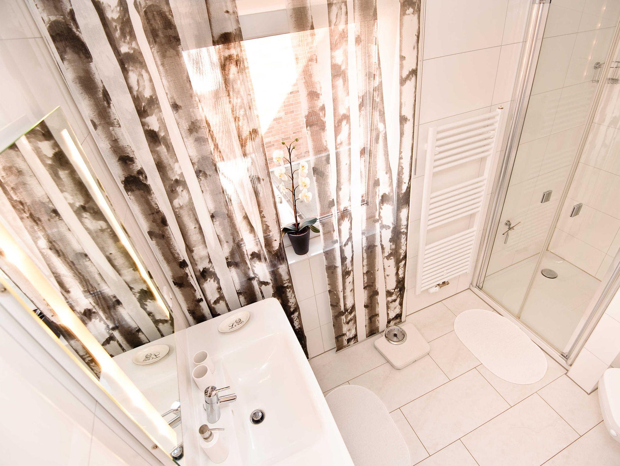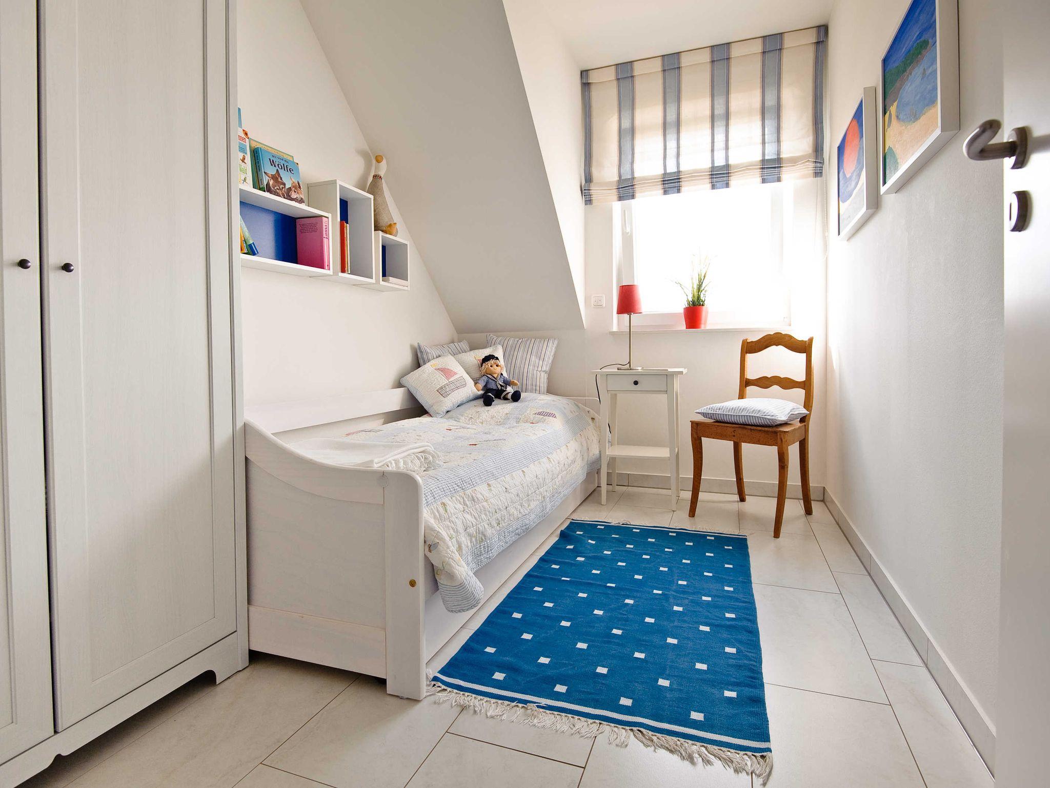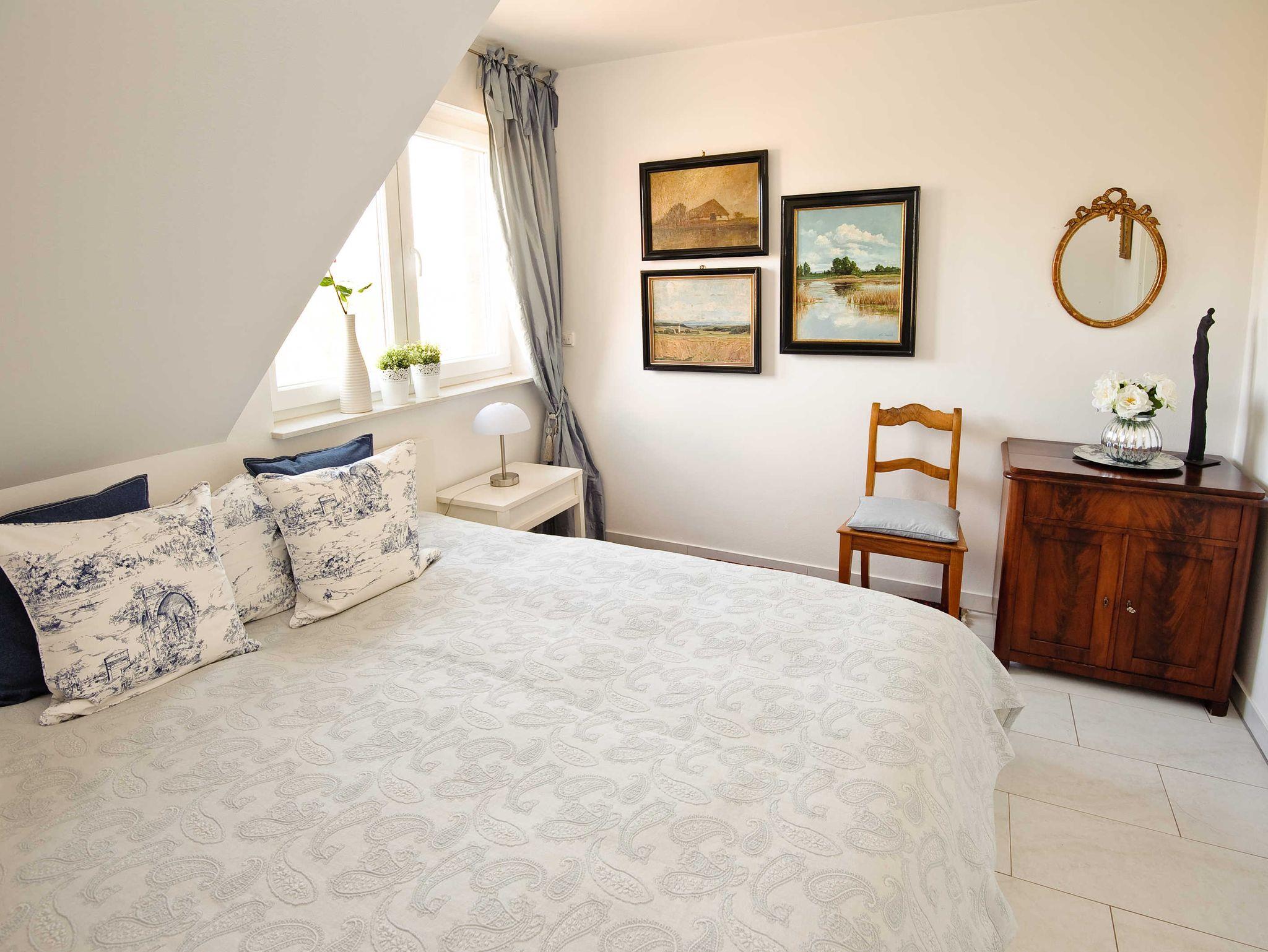 Im 1. OG sind 2 liebevoll eingerichtete Schlafzimmer mit je einem Bett für 1 Person, sowie ein Schlafzimmer mit Doppelbett für 2 Personen, Bad mit WC u. Regendusche. Überall Fußbodenheizung und elektrische Rollos.