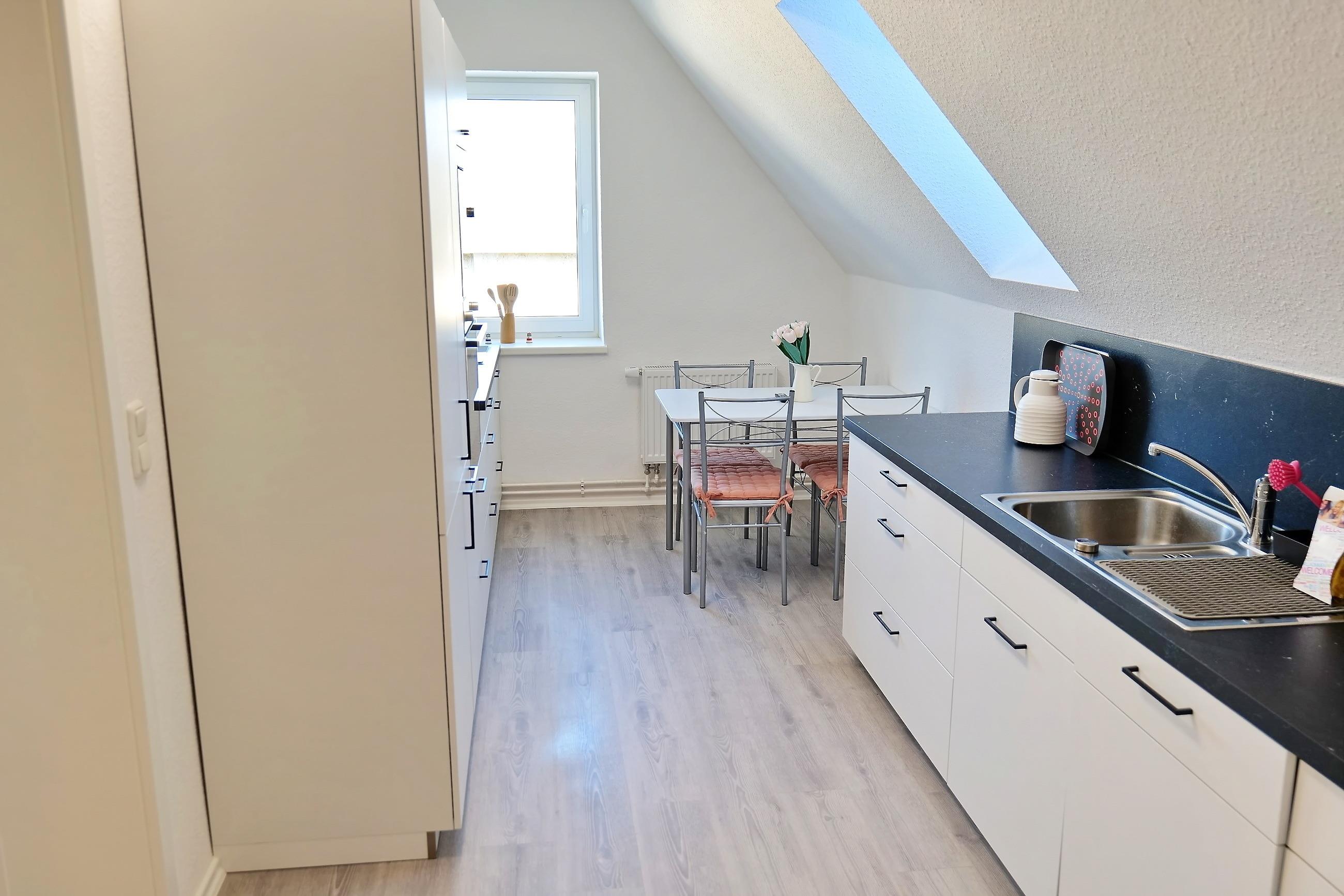 - separate Küche ausgestattet mit Kühlschrank, Kaffeemaschine, Wasserkocher, 4-Platten-Ceran-Herd, Mikrowelle, Toaster, Geschirr, Besteck, Küchenutensilien uvm.