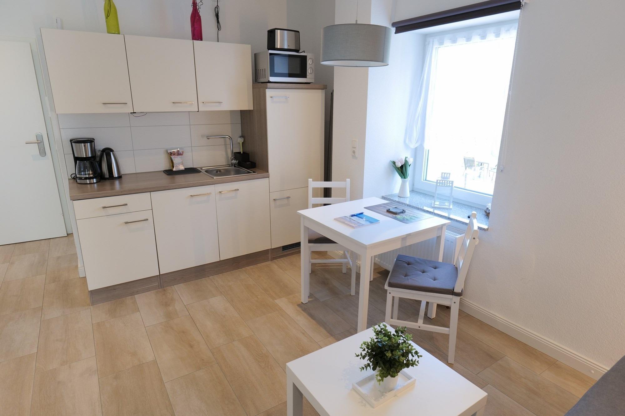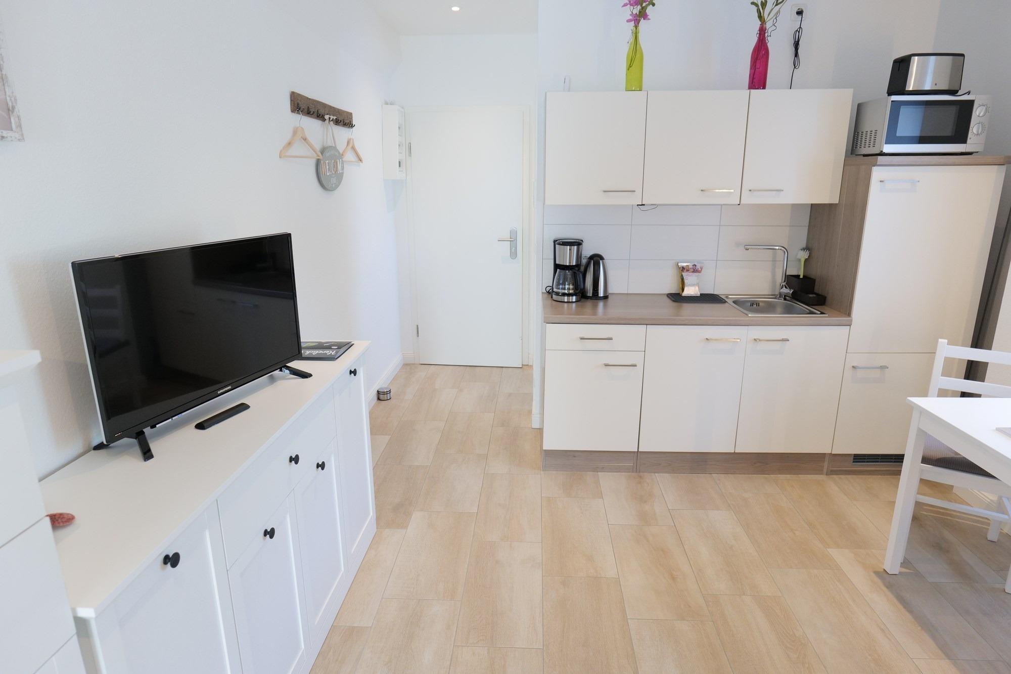 - offene Küche ausgestattet mit Kühlschrank, Kaffeemaschine, Wasserkocher, separater 2-Platten-Herd, Mikrowelle, Toaster, Geschirr, Besteck, Küchenutensilien uvm.