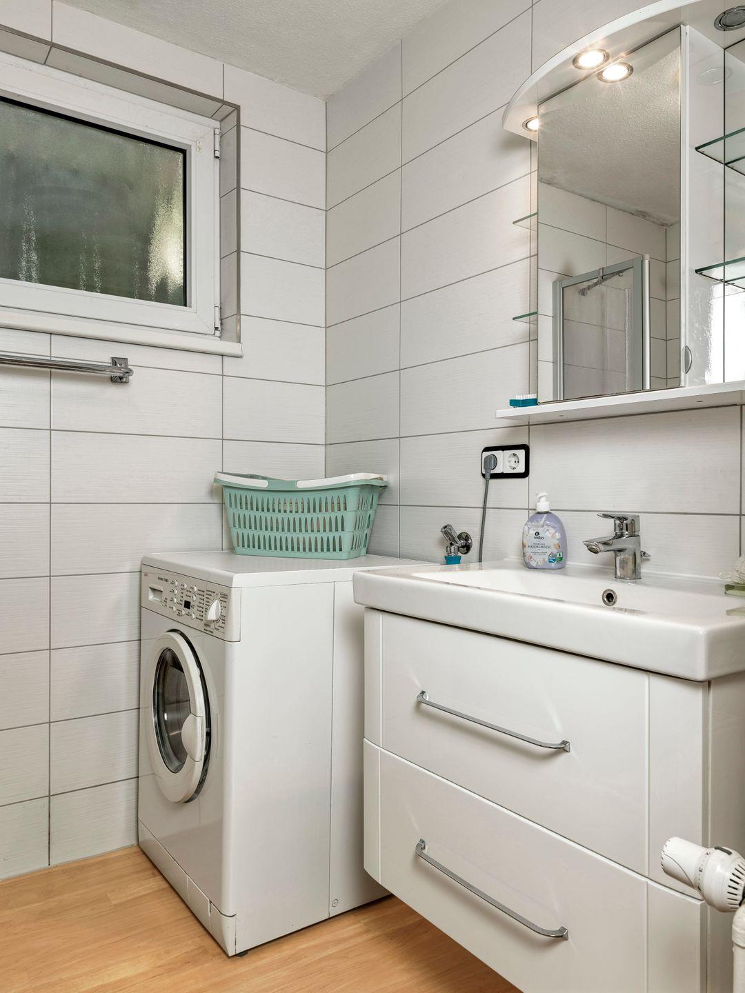Im Untergeschoß befinden sich ein Schlafzimmer mit Doppelbett und TV und ein weiteres Schlafzimmer mit Etagenbett. Im hellen Bad finden Sie eine Dusche mit WC und Waschmaschine mit Trocknerfunktion.