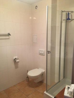 Das Badezimmer verfügt über eine Dusche, ein WC und Waschtisch.