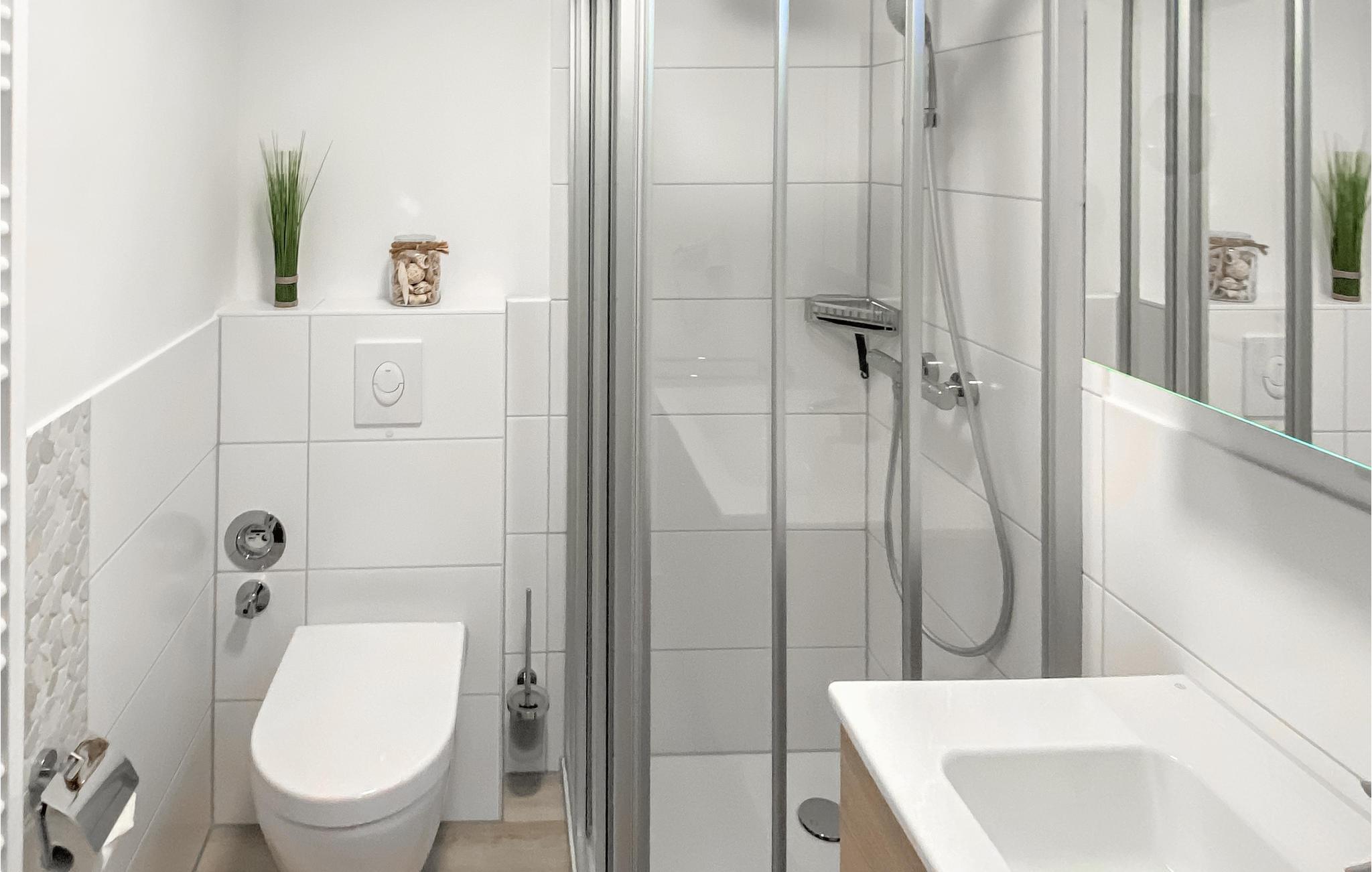 Das Schlafzimmer ist mit einem großen Doppelbett ausgestattet. Eine weitere Schlafmöglichkeit befindet sich im Wohnbereich. Ein breites, hochwertiges Schlafsofa mit Matratze bietet perfekten Schlafkomfort für zwei weitere Gäste. Für das persönliche Wellnesserlebnis verfügt das Badezimmer über eine Regendusche. In den gemütlich eingerichteten Wohn- und Essraum ist eine moderne, vollwertig ausgestattete Küche eingegliedert.