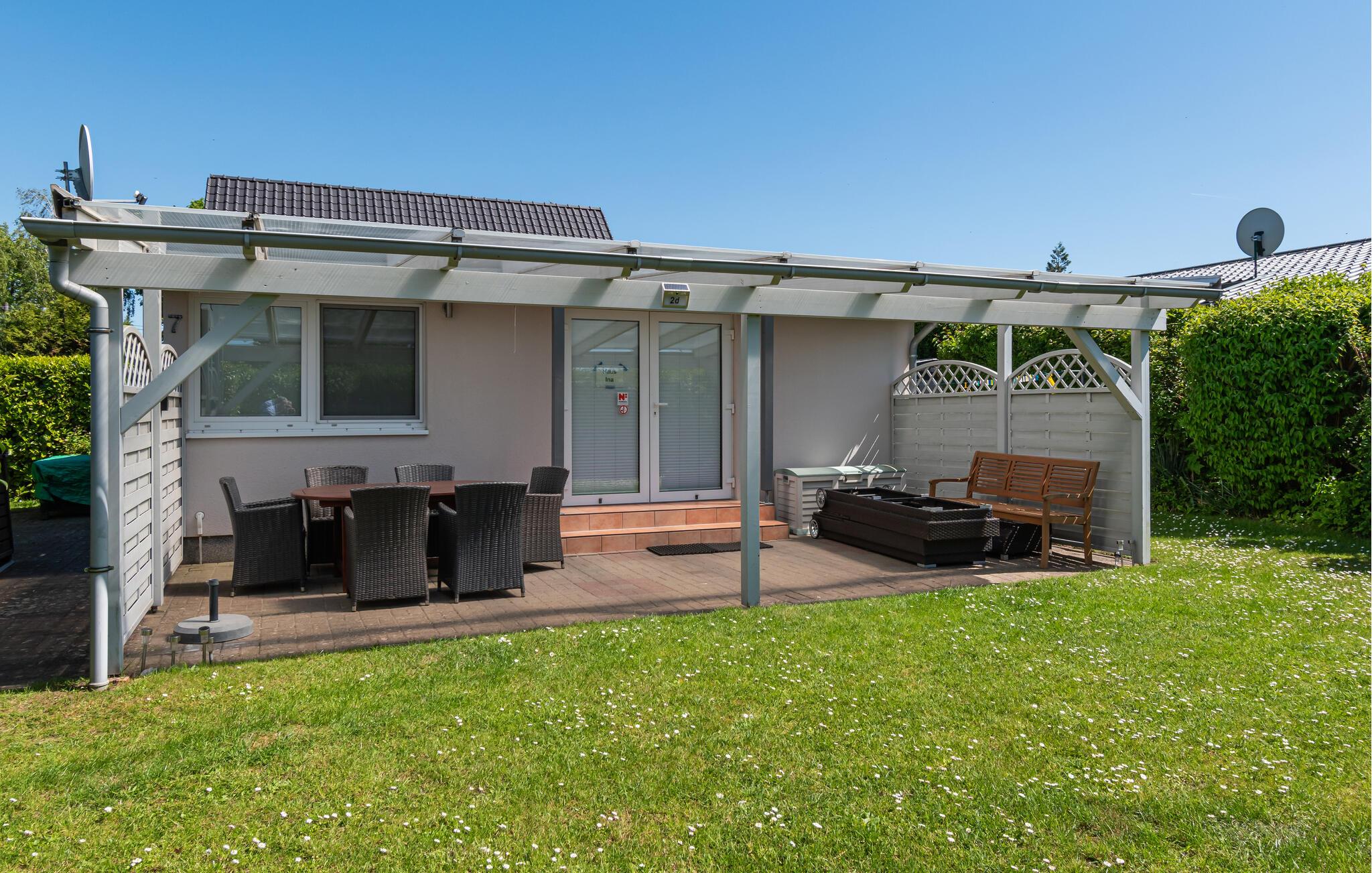 Gemütlicher Bungalow mit großer Terrasse und Meerblick auf der Insel Poel, ideal für entspannte Ostseeferien.