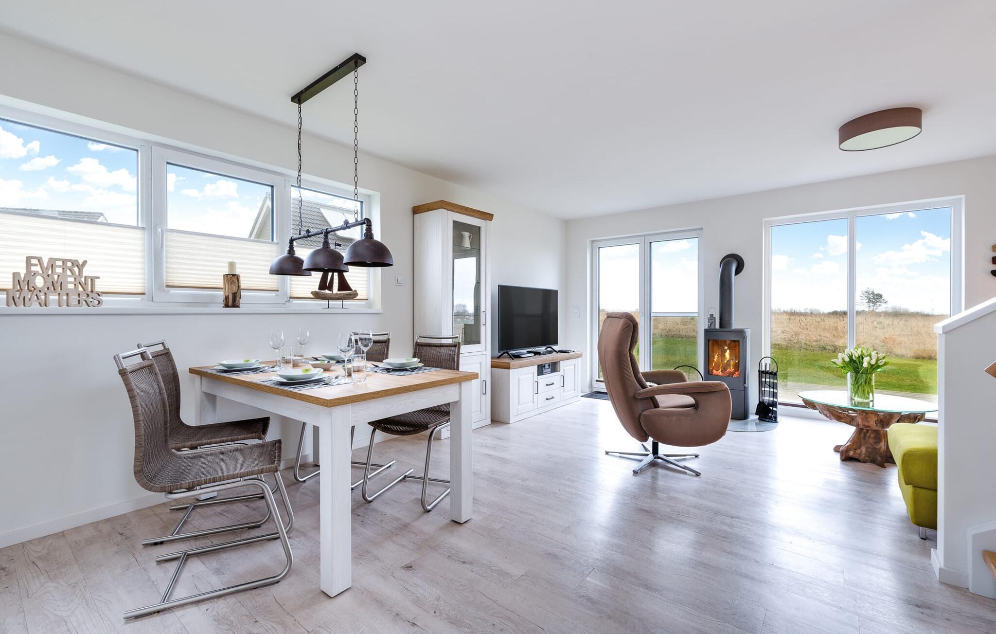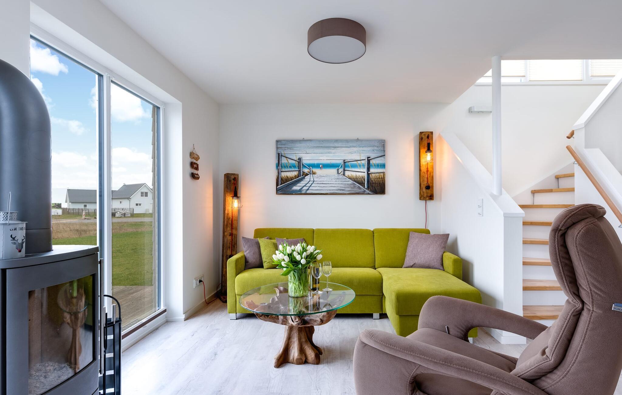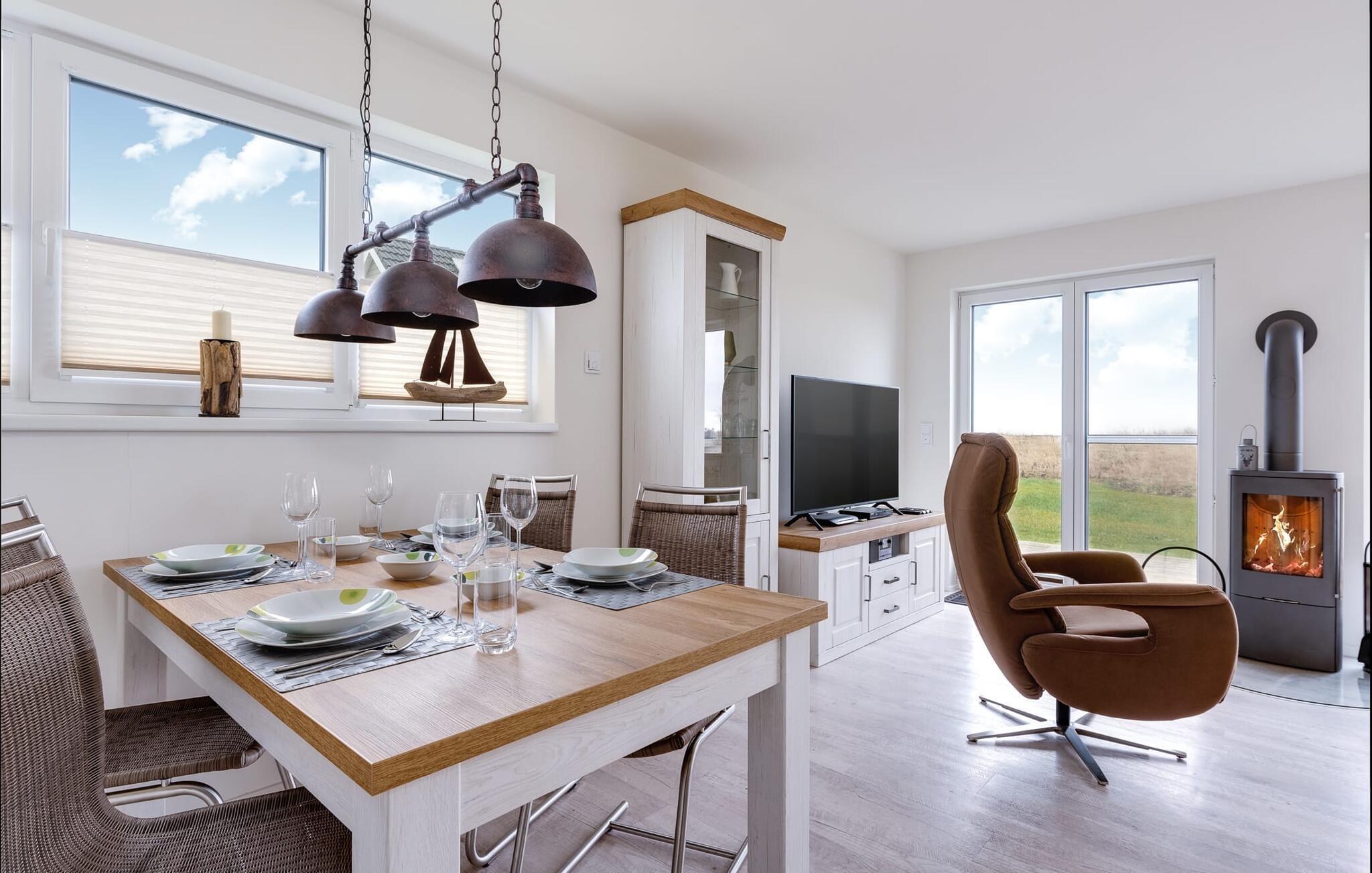 Der gemütliche Wohnbereich bietet direkten Zugang zur Natur. Ausgestattet mit einem gemütlichen L-Sofa, lässt es sich hier auch an Schietwetter-Tagen vor dem Kamin gemütlich entspannen.