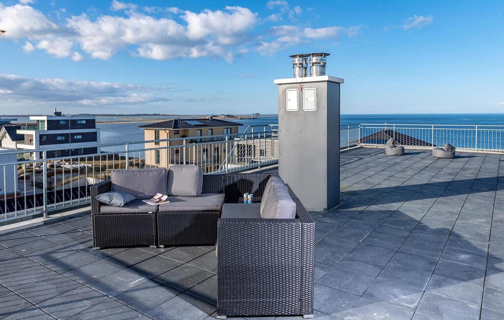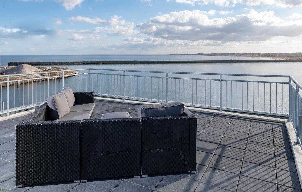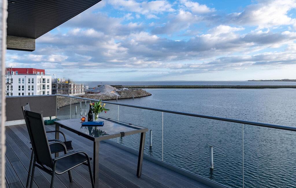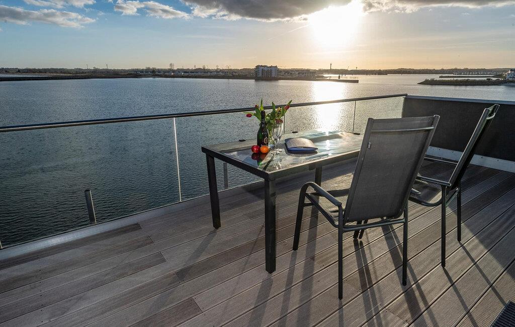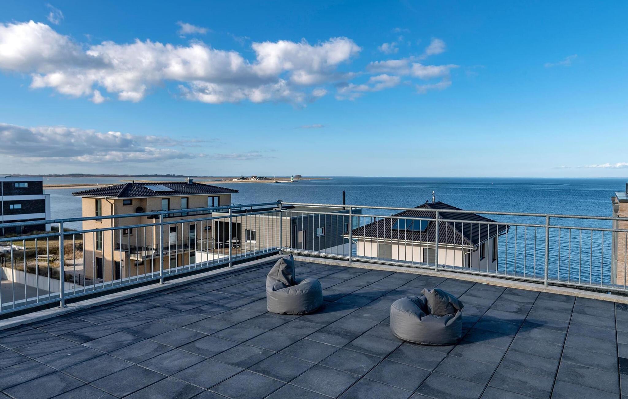 Den Urlaub über den Dingen verbringen. Das Highlight dieser Ferienwohnung stellt die an den Wohnbereich angrenzende Wasserterrasse mit ganztägiger Traumaussicht und Sonne dar, die über eine seitlich umlaufende Terrasse auf die Dachterrasse führt. Mit einem 360° Wasserblick über die Marina, das OstseeResort und die Ostsee lässt es sich hier tiefenentspannen.