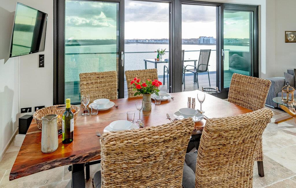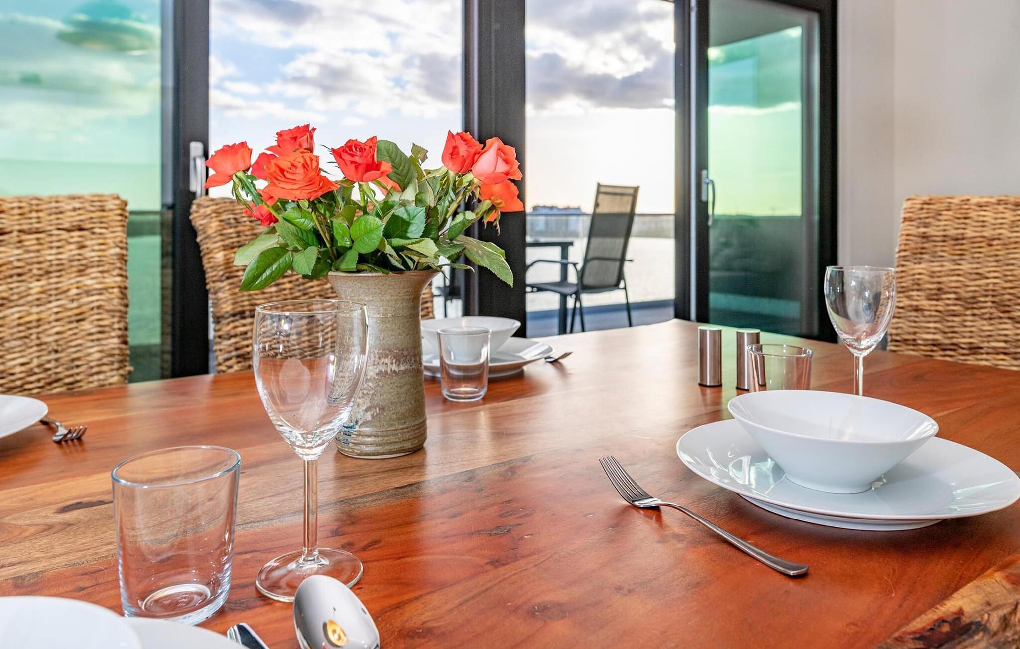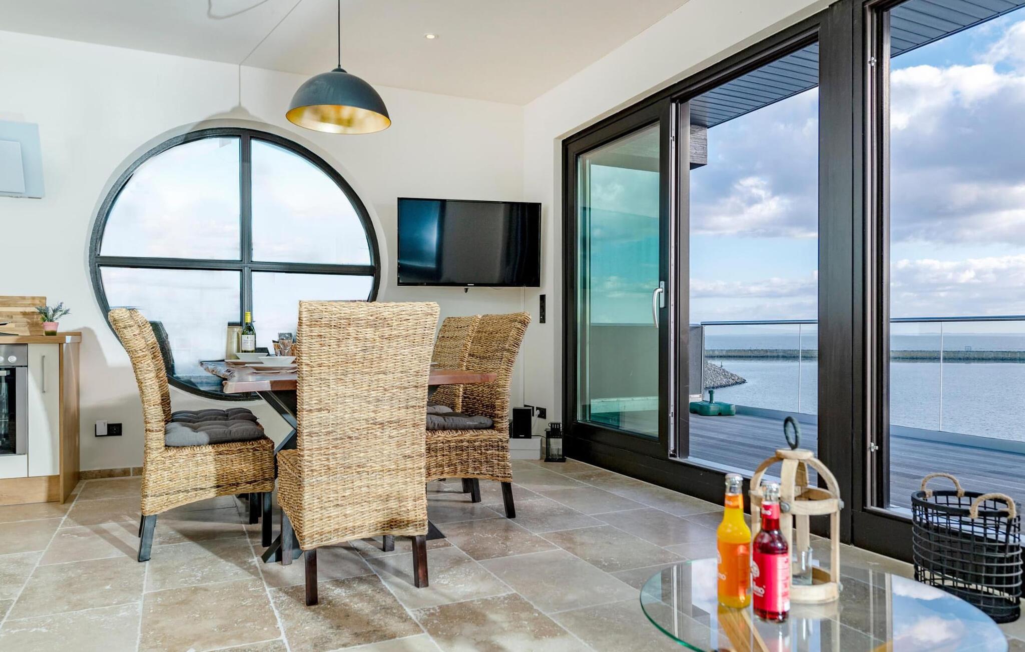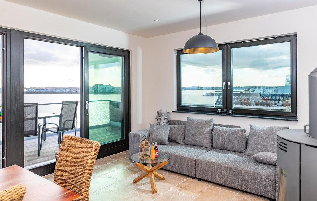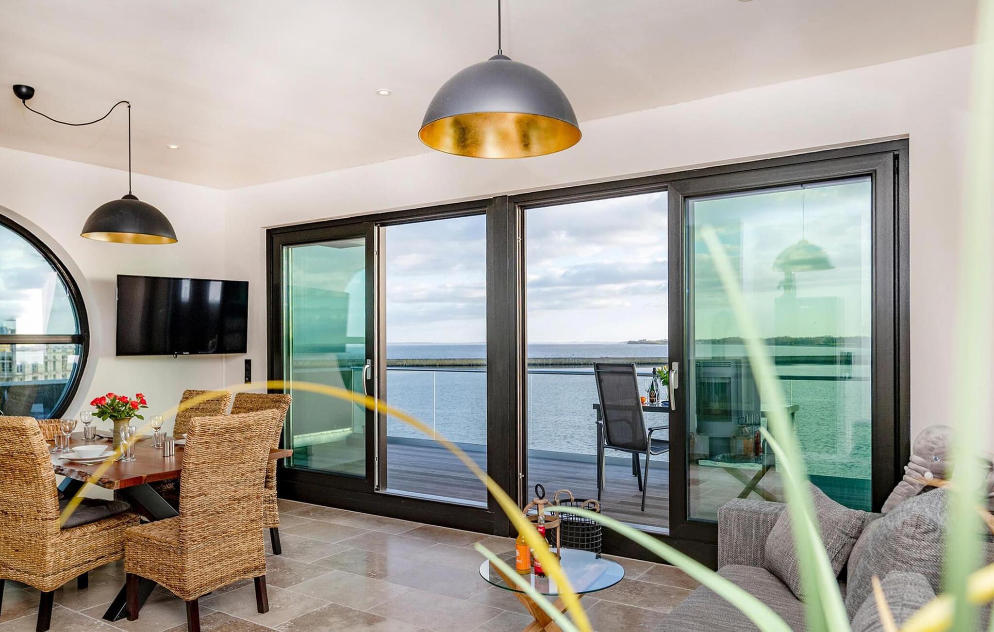Den Urlaub über den Dingen verbringen. Das Highlight dieser Ferienwohnung stellt die an den Wohnbereich angrenzende Wasserterrasse mit ganztägiger Traumaussicht und Sonne dar, die über eine seitlich umlaufende Terrasse auf die Dachterrasse führt. Mit einem 360° Wasserblick über die Marina, das OstseeResort und die Ostsee lässt es sich hier tiefenentspannen.