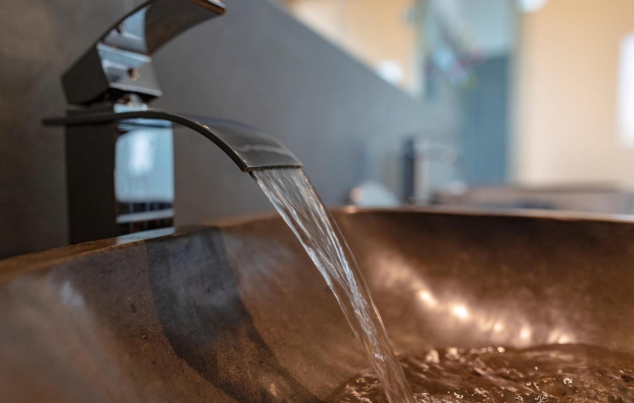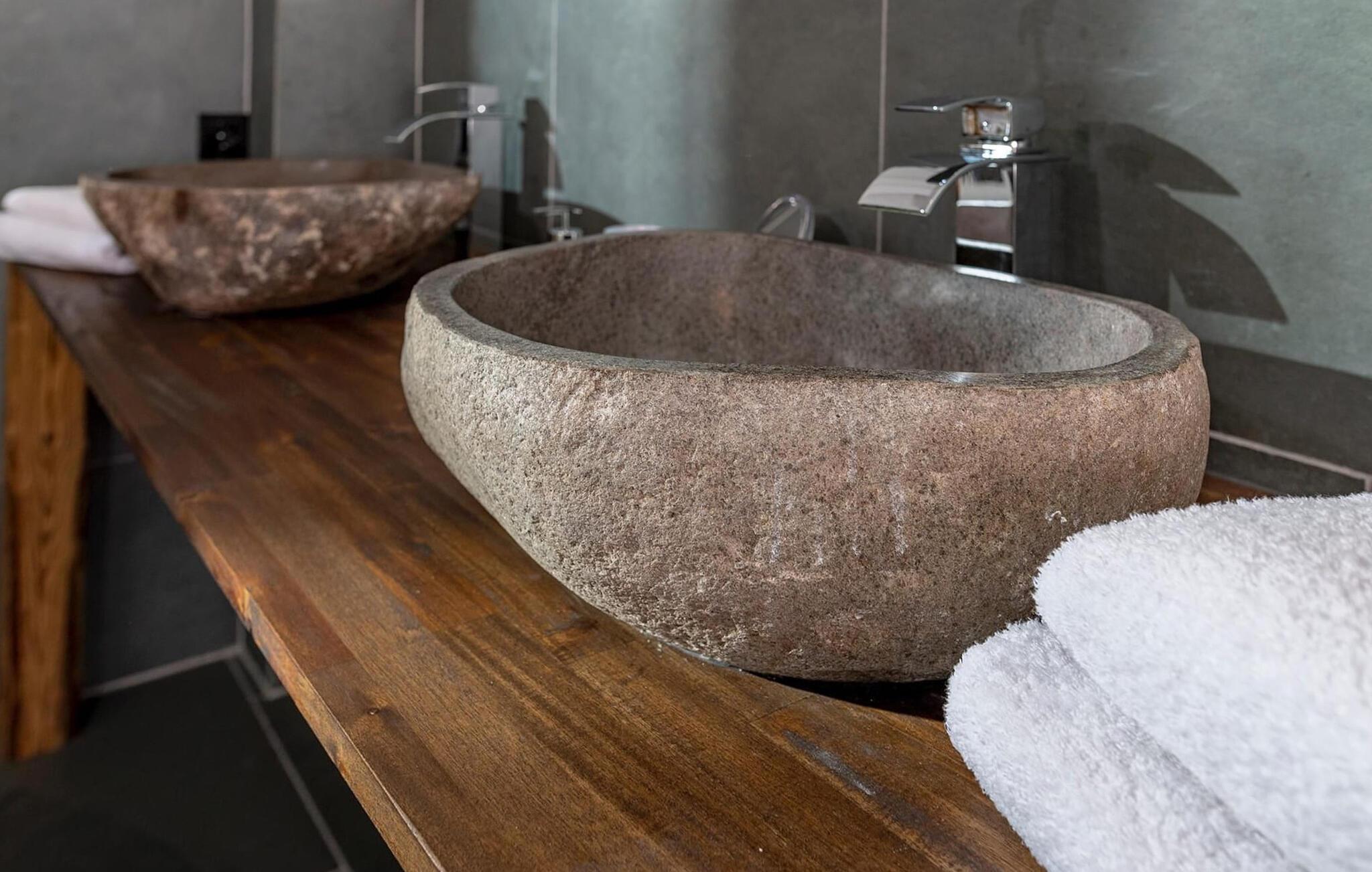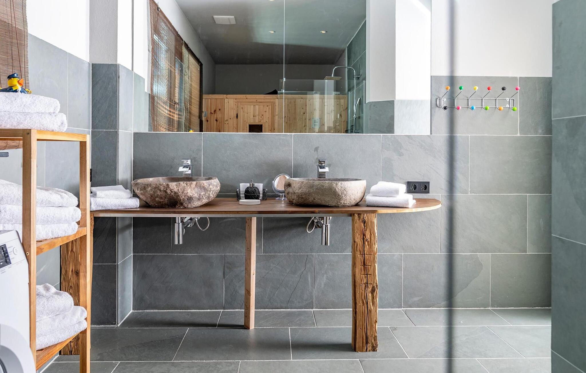 Das Naturstein-Duschbad mit brasilianischem Schiefer verfügt über eine finnische Sauna und aus Flussstein handgefertigte Waschbecken. Für zusätzlichen Komfort sorgt ein Gäste-WC.