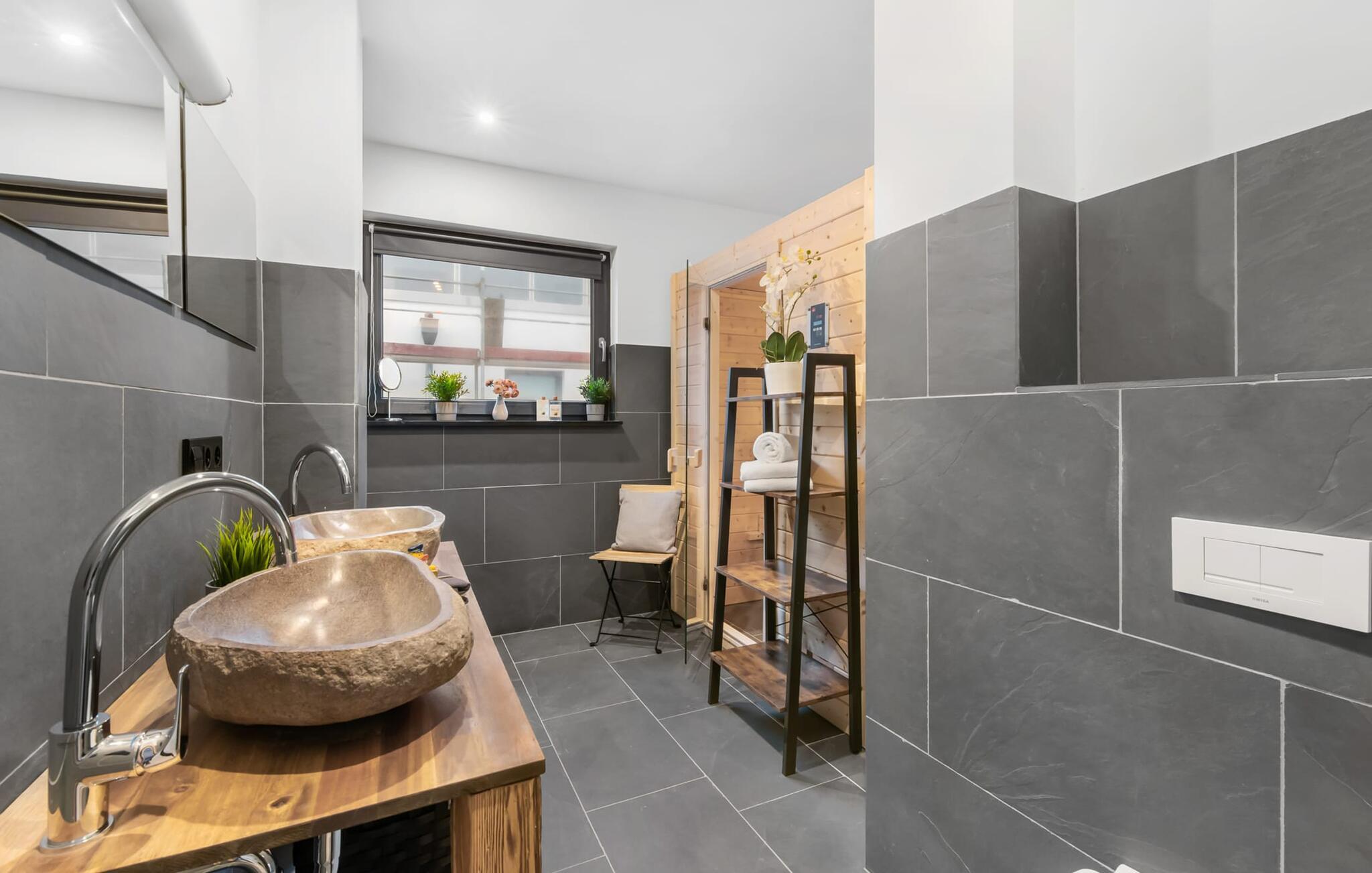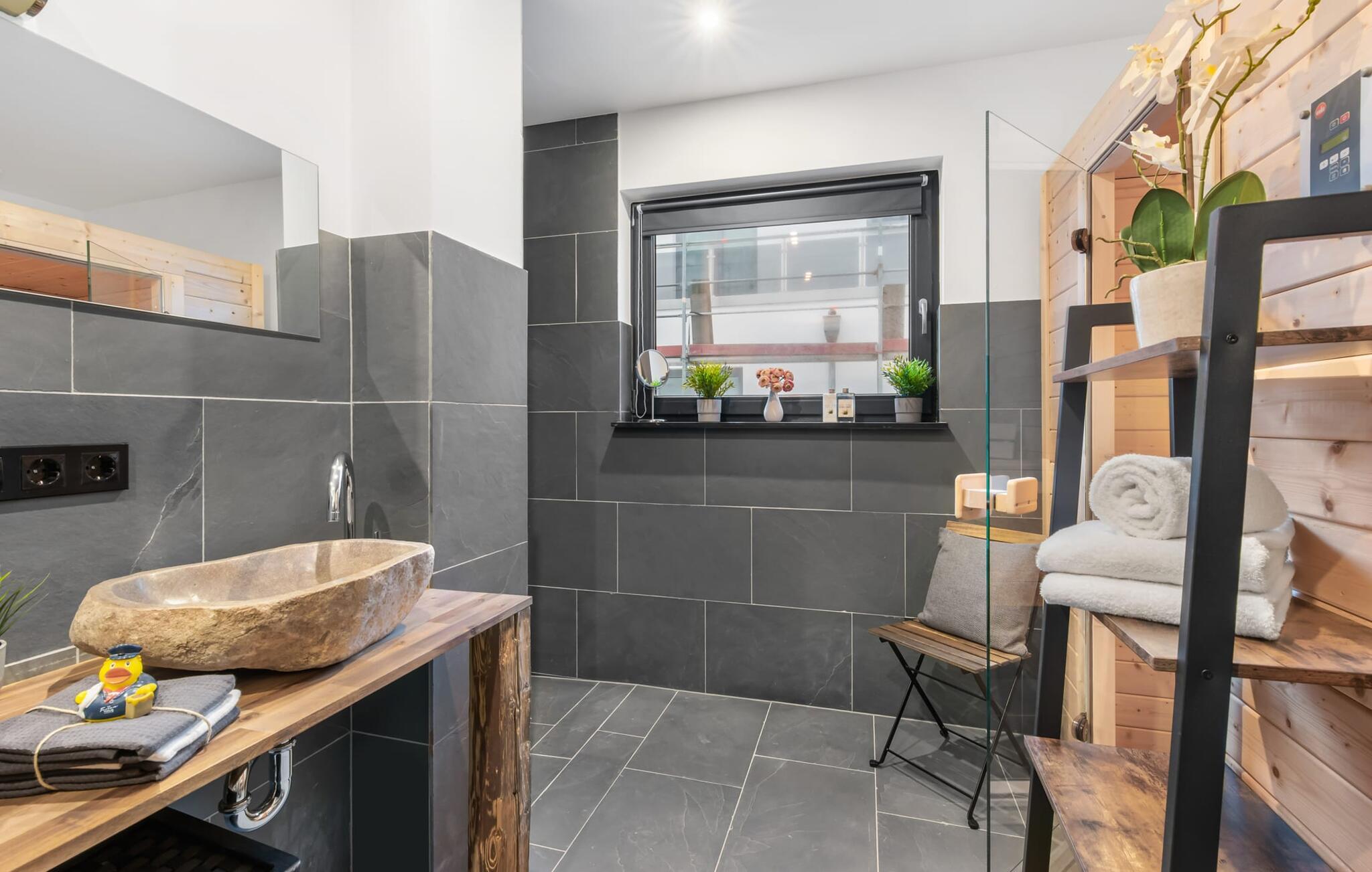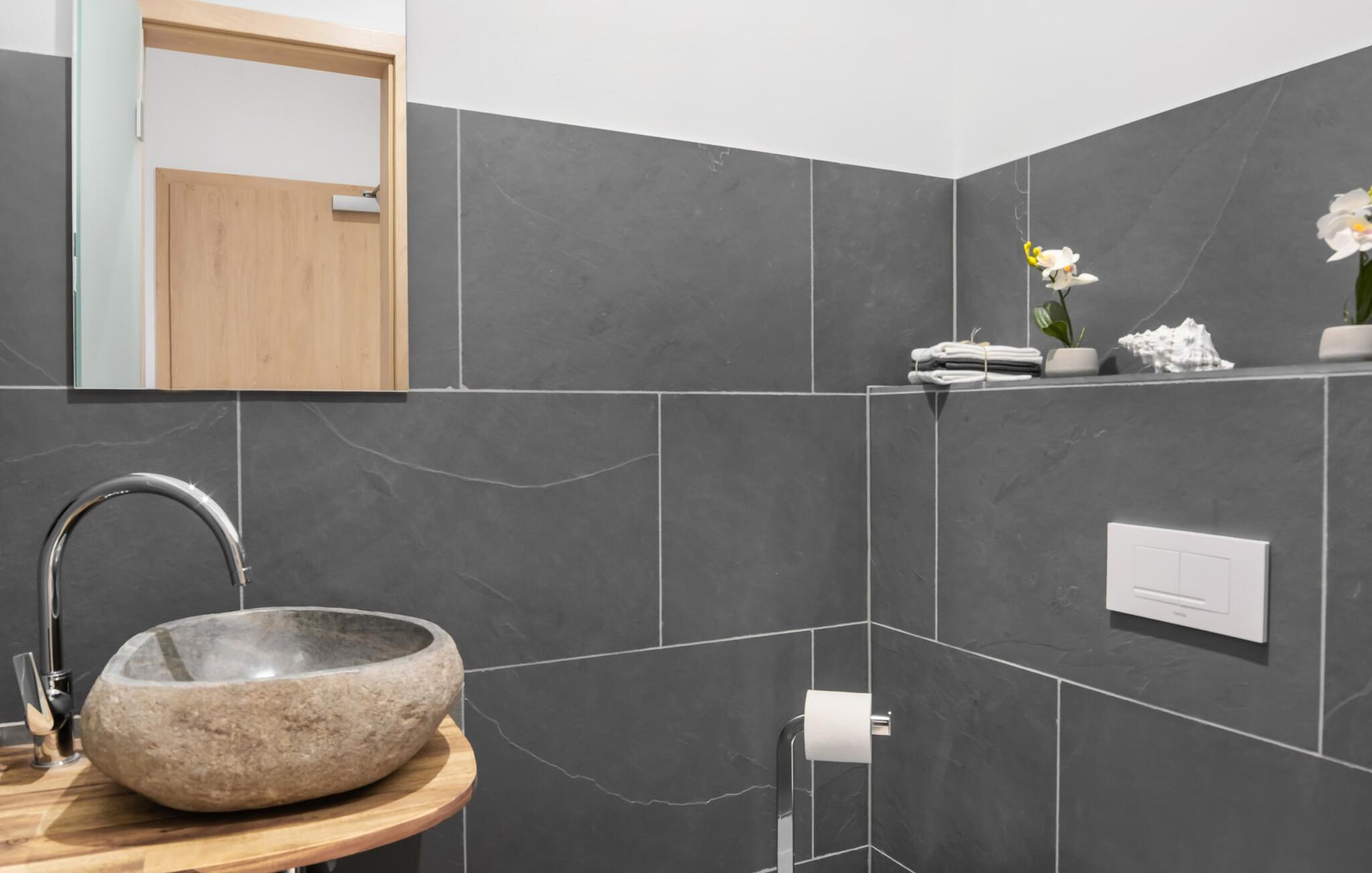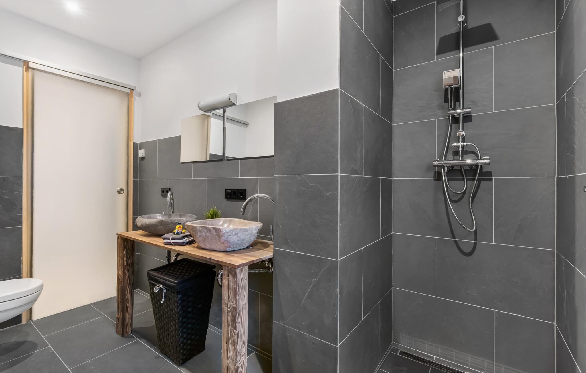 Das Naturstein-Duschbad aus brasilianischem Schiefer verfügt über eine finnische Sauna, eine große Regenschauerdusche und handgefertigte Waschbecken aus Flussstein. Hier lassen sich wahre SPA-Momente erleben! Für zusätzlichen Komfort sorgt ein Gäste WC.