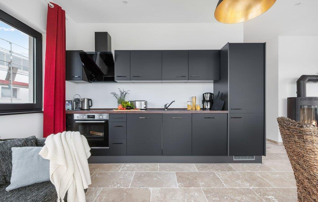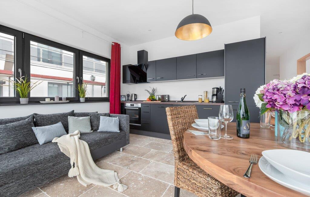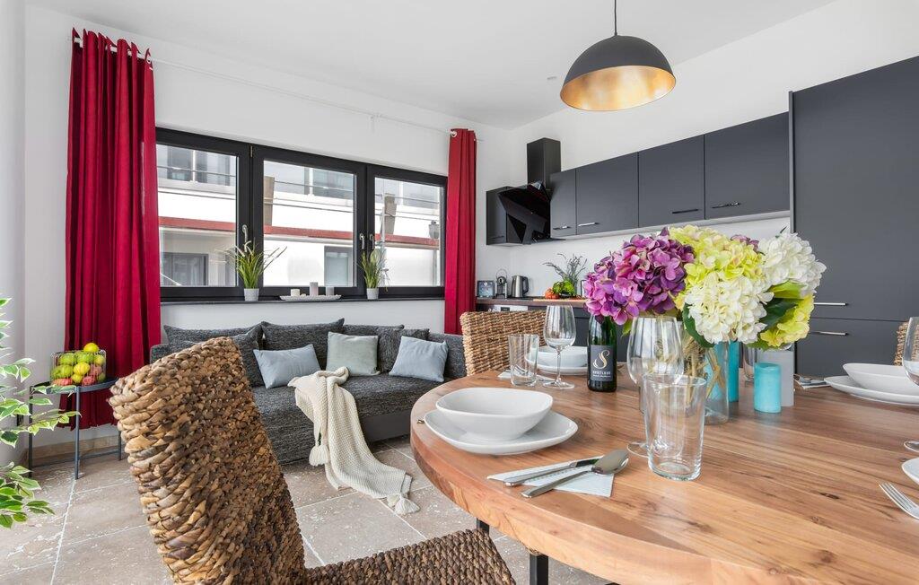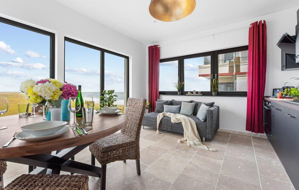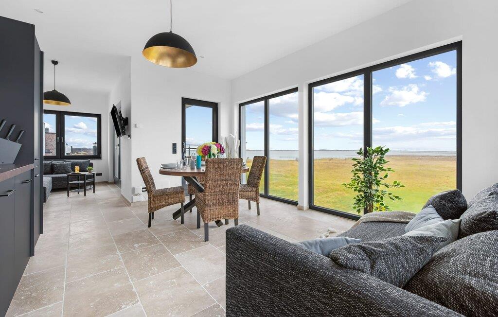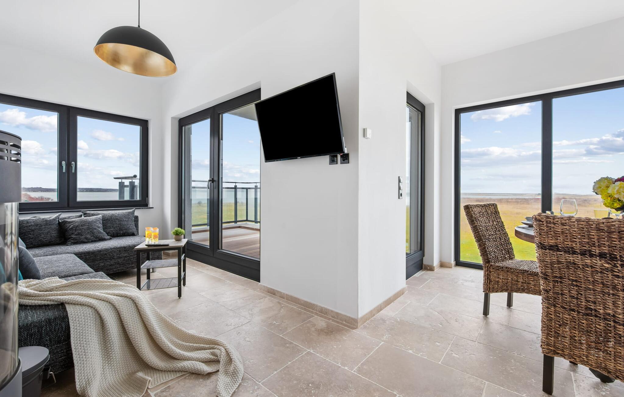 Der großzügige Wohn-/Essbereich mit angeschlossener großer Loggia bietet einen traumhaften Blick in die Natur und auf die Wellen der Ostsee. Naturstein Fußböden aus hellen italienischem Travertin und Fußbodenheizung in der ganzen Wohnung, bieten gemeinsam mit dem ökologischen Baukonzept aus Ziegelmauerwerk und Kalkputz höchsten Wohnkomfort. Dank bodentiefer Fenster ist die Ferienwohnung lichtdurchflutet. Die rundum ausgestattete Bosch-Markenwohnküche bietet alle Annehmlichkeiten. Offen gestaltet fällt sogar beim Kochen der Blick auf die Schlei und die Ostsee. Die große Loggia bietet bei schönstem Ausblick Relaxen und Essen im Freien. Was will man Meer?