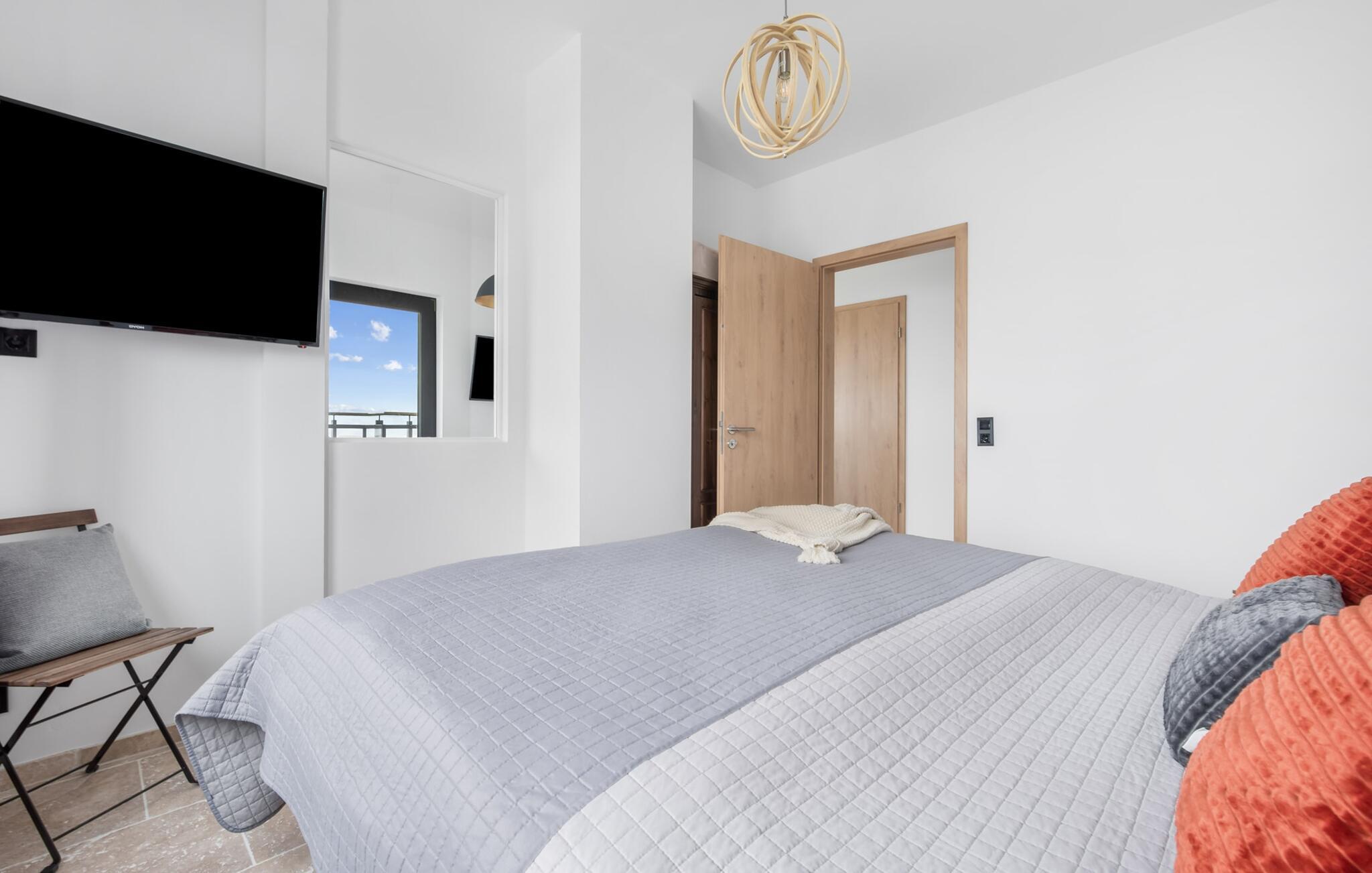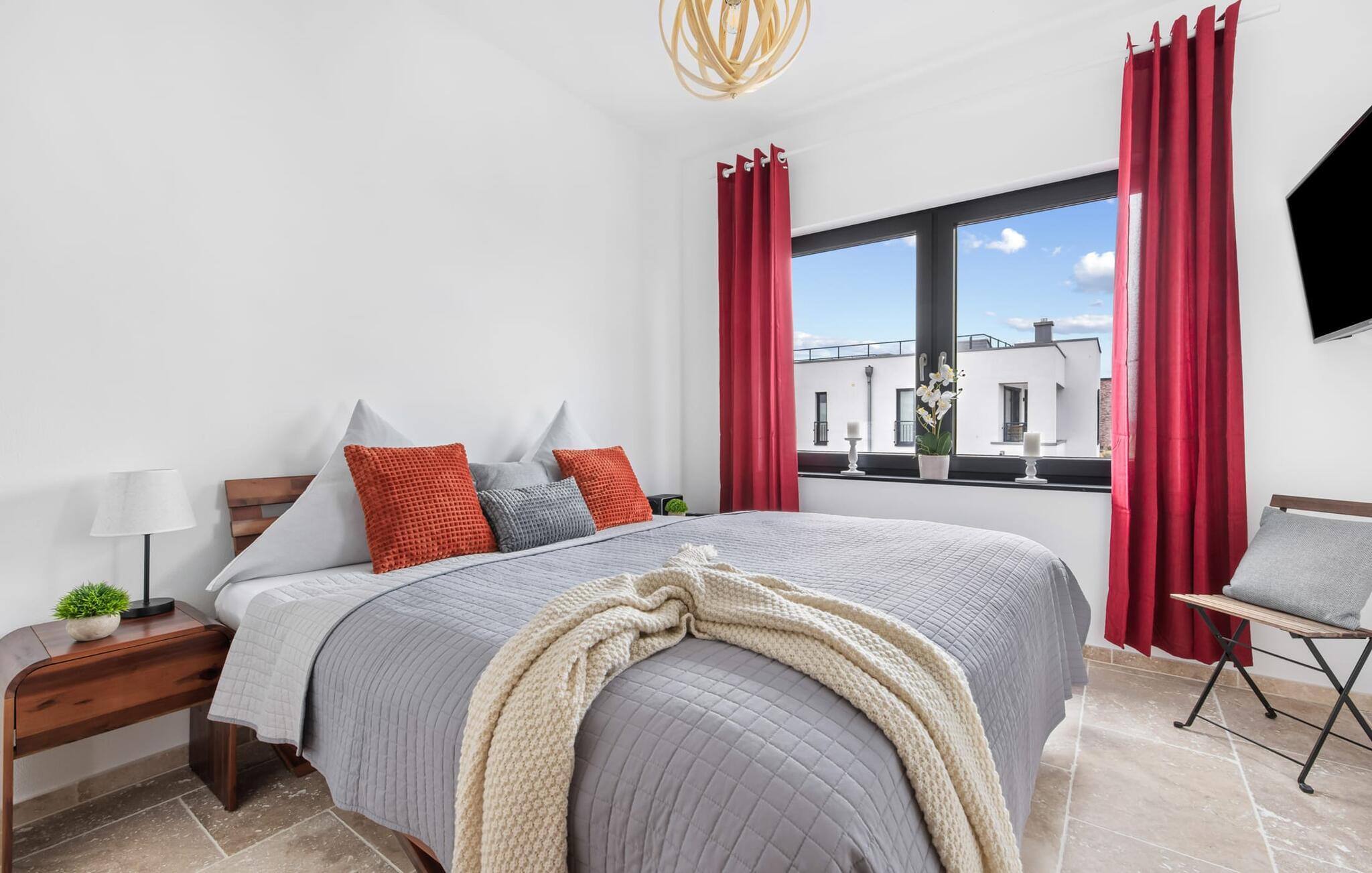 Das Hauptschlafzimmer mit Blick auf die Schlei ist mit einem Doppelbett und einem Flachbildfernseher ausgestattet. Das zweite Schlafzimmer verfügt über zwei Einzelbetten.Eine Schlafcouch bietet einer weiteren Person eine zusätzliche Übernachtungsmöglichkeit.