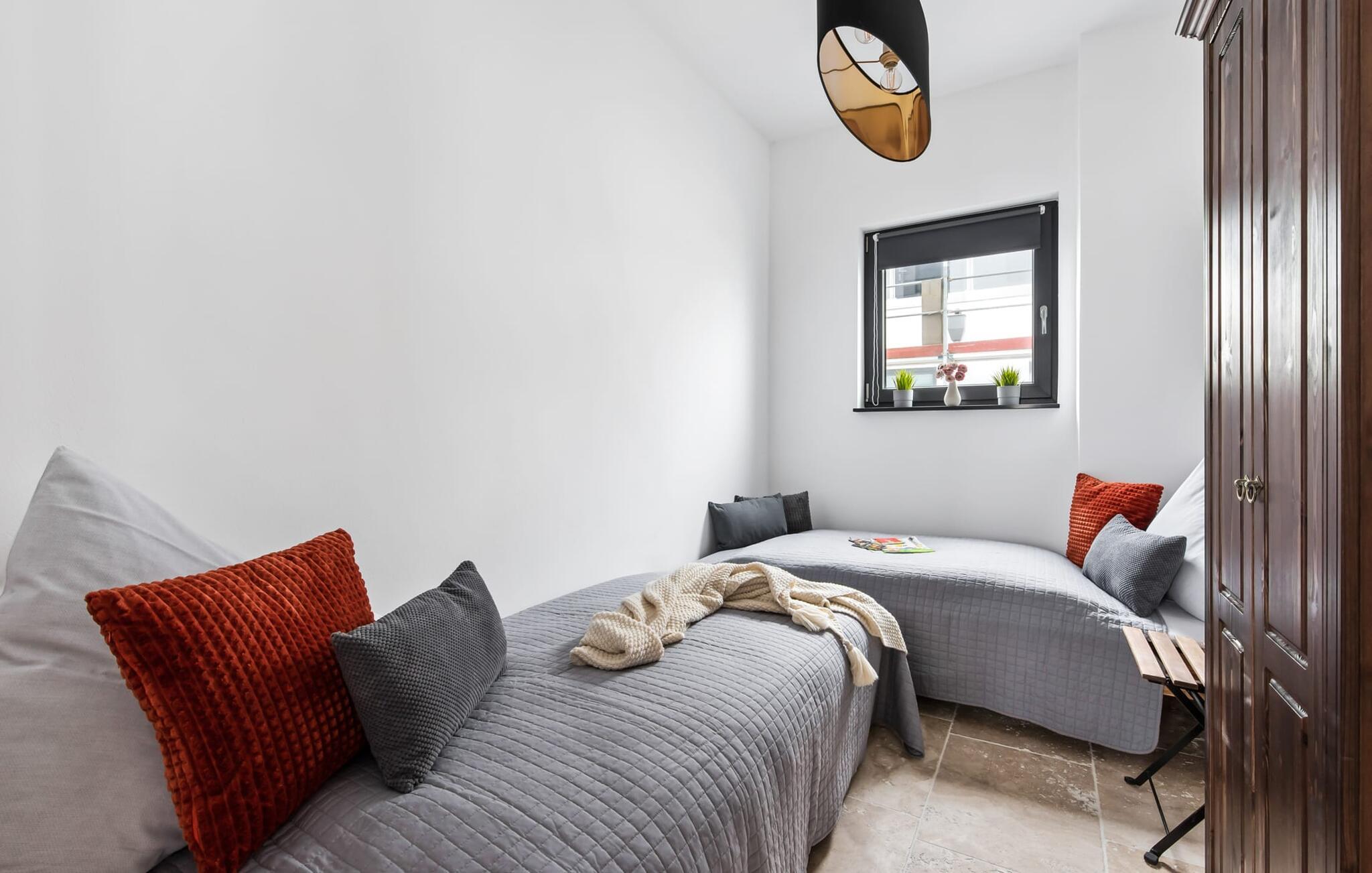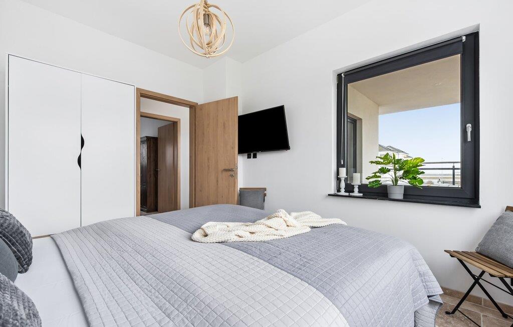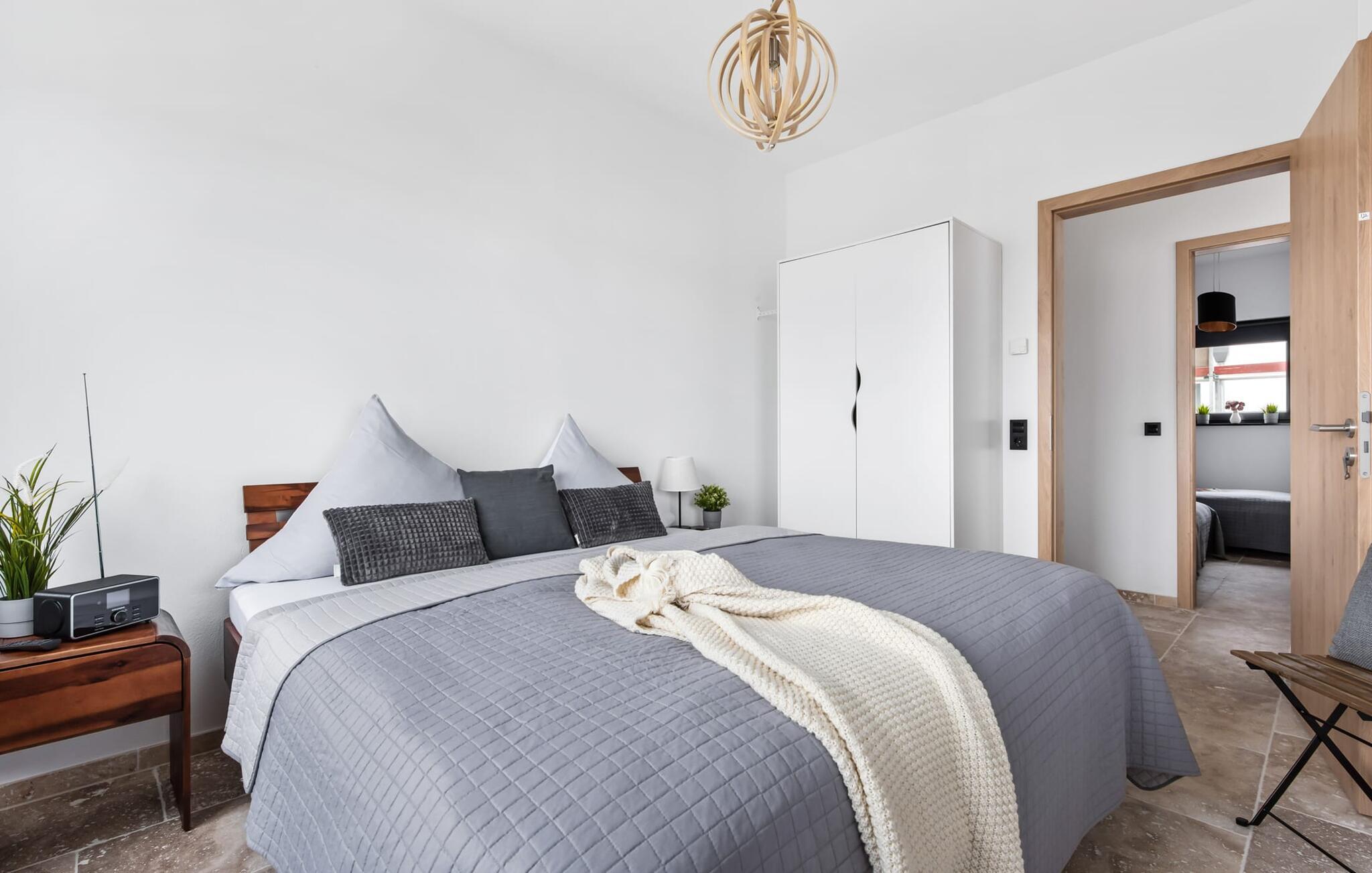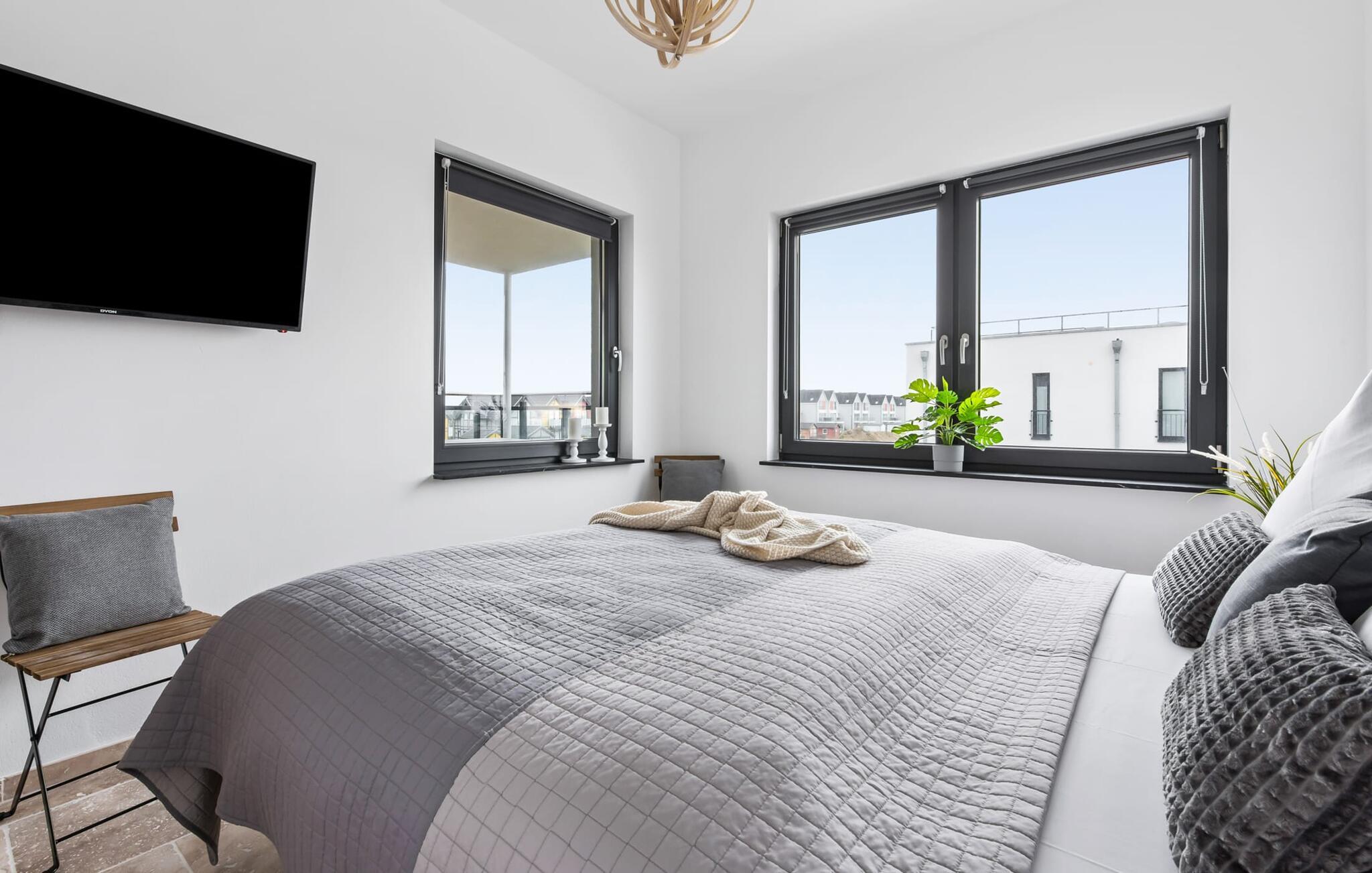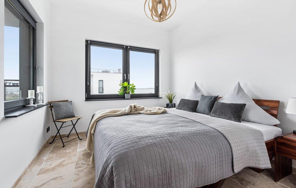 Zwei Schlafzimmer bieten vier Erwachsenen Platz zum Schlafen und Träumen. Das elegant eingerichtete Hauptschlafzimmer mit seitlichem Blick auf die Schlei ist mit einem Doppelbett und einem Flachbildfernseher ausgestattet, das zweite Schlafzimmer verfügt über zwei Einzelbetten. Ein Schlafsofa im Wohnbereich erlaubt die Übernachtung einer weiteren Person.