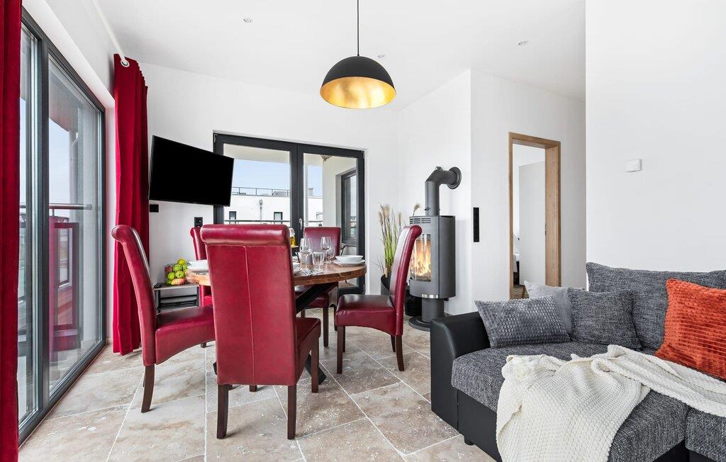 Der großzügige Wohn-/Essbereich mit Blick auf den Badestrand bietet ausreichend Platz für fünf Personen, zum Kochen und Genießen. Naturstein Fußböden aus italienischem, hellen Travertin sorgen für Gemütlichkeit. Dank bodentiefer Fenster ist die Ferienwohnung lichtdurchflutet, hell und freundlich. Die offen gestaltete und rundum ausgestattete Wohnküche von Bosch bietet alle Annehmlichkeiten, hier bleiben keine Wünsche offen. Die angrenzende Loggia ist groß genug, um dort gemütlich zu speisen, zu relaxen oder schöne Lesestunden zu verbringen. Mit Fußbodenheizung, Kamin und den bodentiefen Fenstern ist diese Ferienwohnung zu jeder Jahreszeit ein ganz besonderes Domizil im OstseeResort Olpenitz. Hier kommen auch anspruchsvolle Gäste ganz bestimmt auf ihre Kosten.