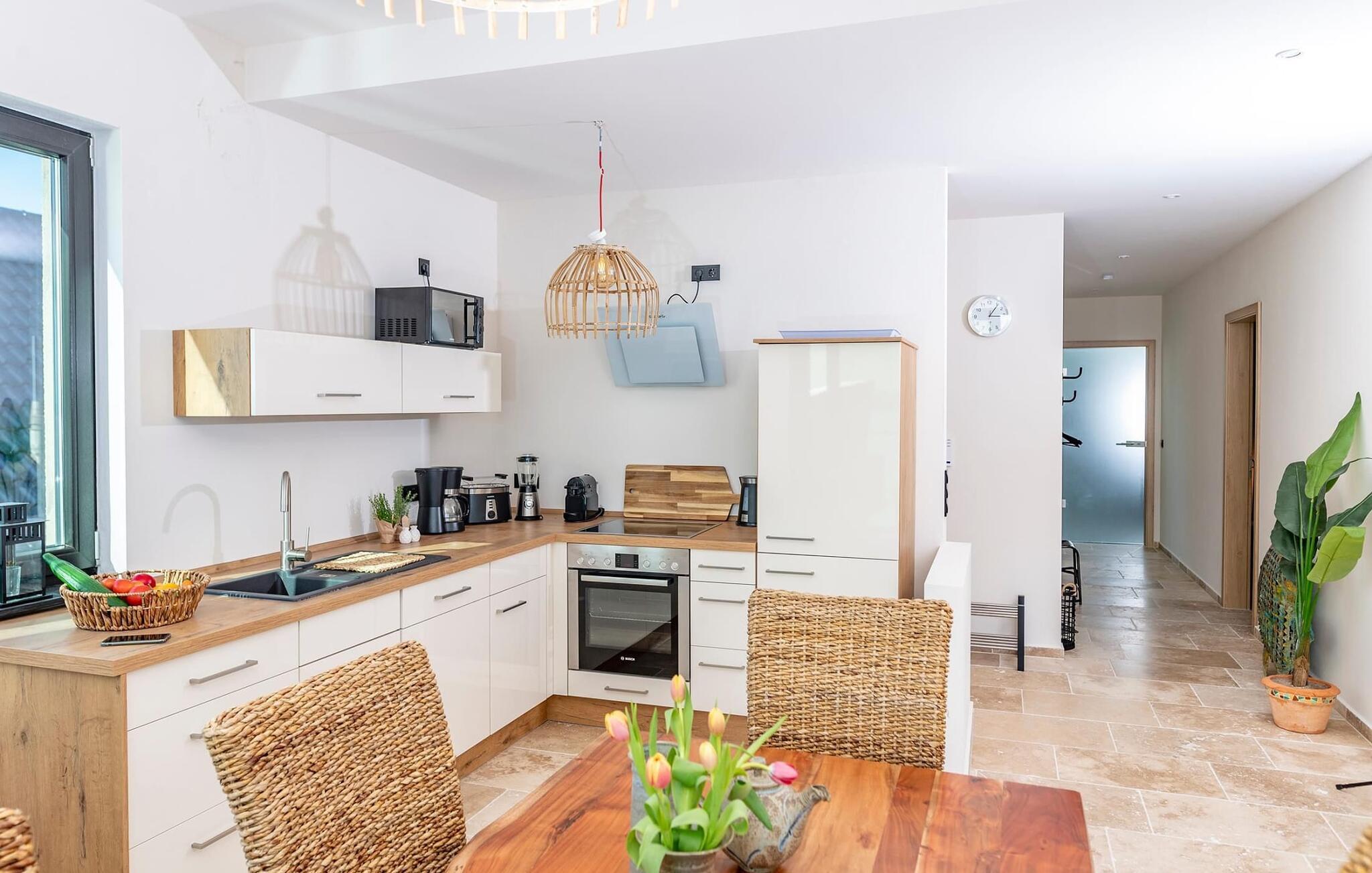 In der offenen Wohnküche bleiben keine Wünsche offen, denn rundum ausgestattet lassen sich hier köstliche Urlaubsmahlzeiten zubereiten.