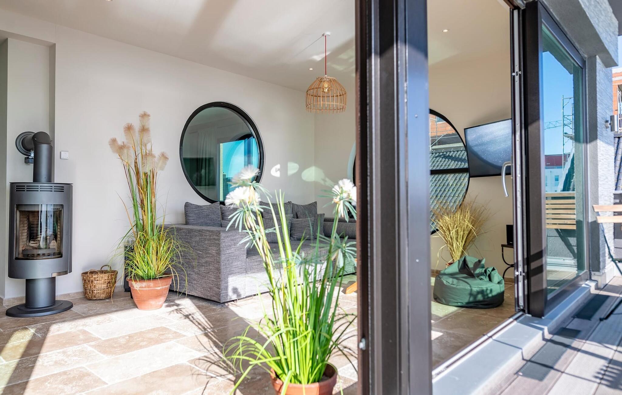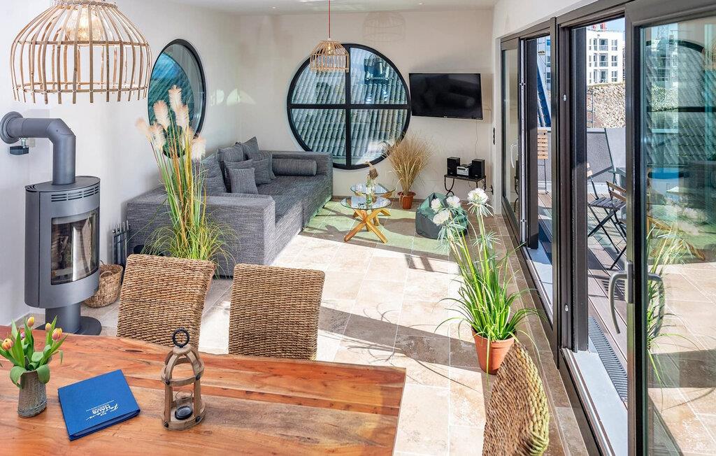 Die Südausrichtung der großzügigen Terrasse an der Marina verspricht ganztags Sonne, während Kaminofen und Fußbodenheizung in der ganzen Ferienwohnung für angenehmen Komfort zu jeder Jahreszeit sorgen.
