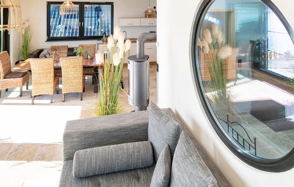 Die einzigartige Architektur mit beeindruckend hohen Decken und bodentiefen Fensterfronten schafft ein unvergessliches Urlaubserlebnis, denn das Wasser ist zum Greifen nah. Für ein angenehmes Raumklima sorgt der biologische Bau mit Kalk-Putz, während Naturstein-Fußböden aus italienischem, hellem Travertin im wahrsten Sinne erden. Hochwertig ausgestattet präsentiert sich dieses Ferienobjekt in einzigartigem Design mit Souvenirs aus aller Welt. Jeder Raum verfügt zudem über eine andere natürliche Wandfarbe. Die komplett verspiegelten Scheiben schaffen maximale Privatsphäre.