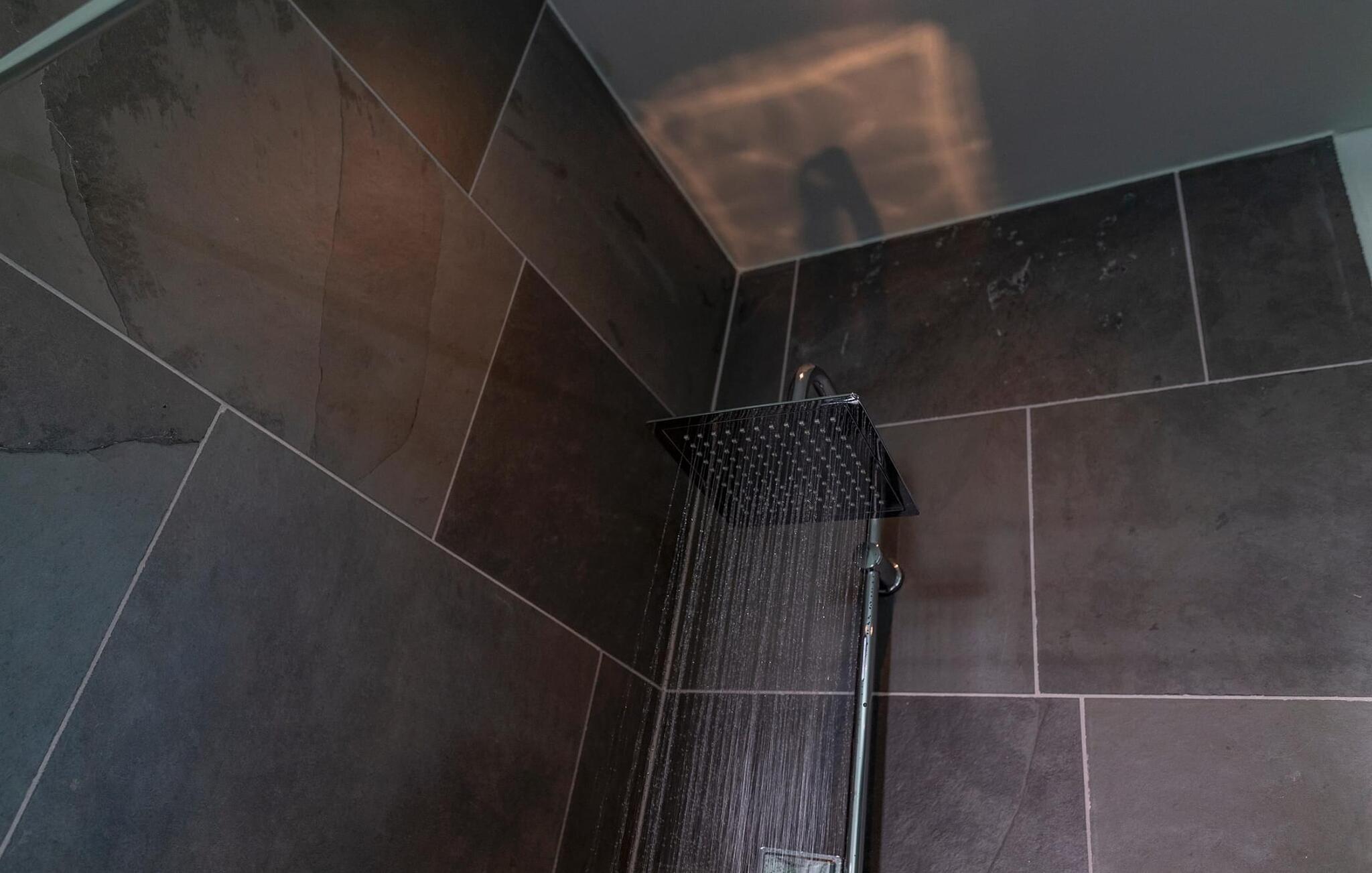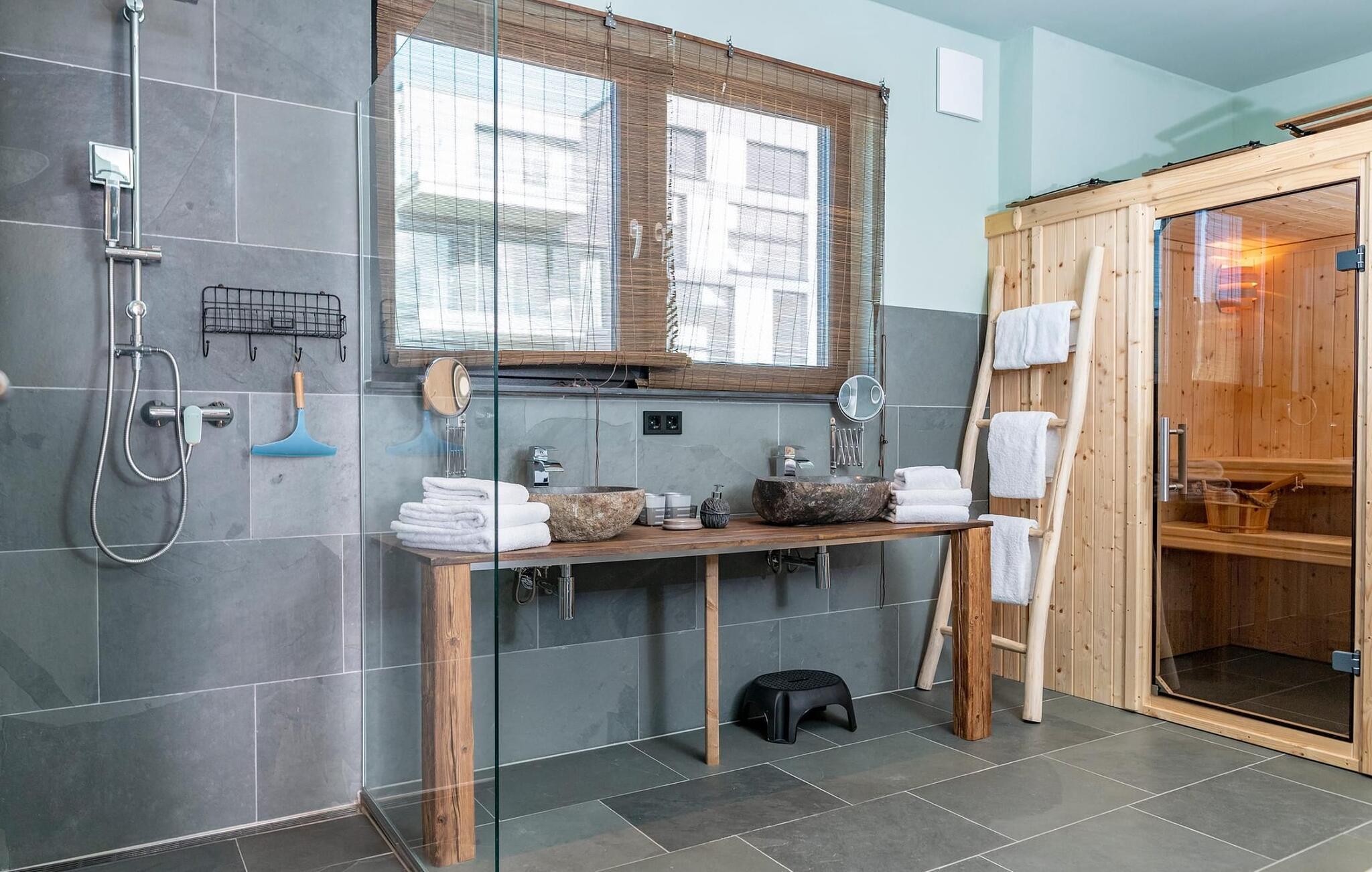 Das Naturstein-Duschbad aus brasilianischem Schiefer verfügt über handgefertigte Waschbecken aus Flussstein. Für zusätzlichen Komfort sorgt ein edles Gäste WC.