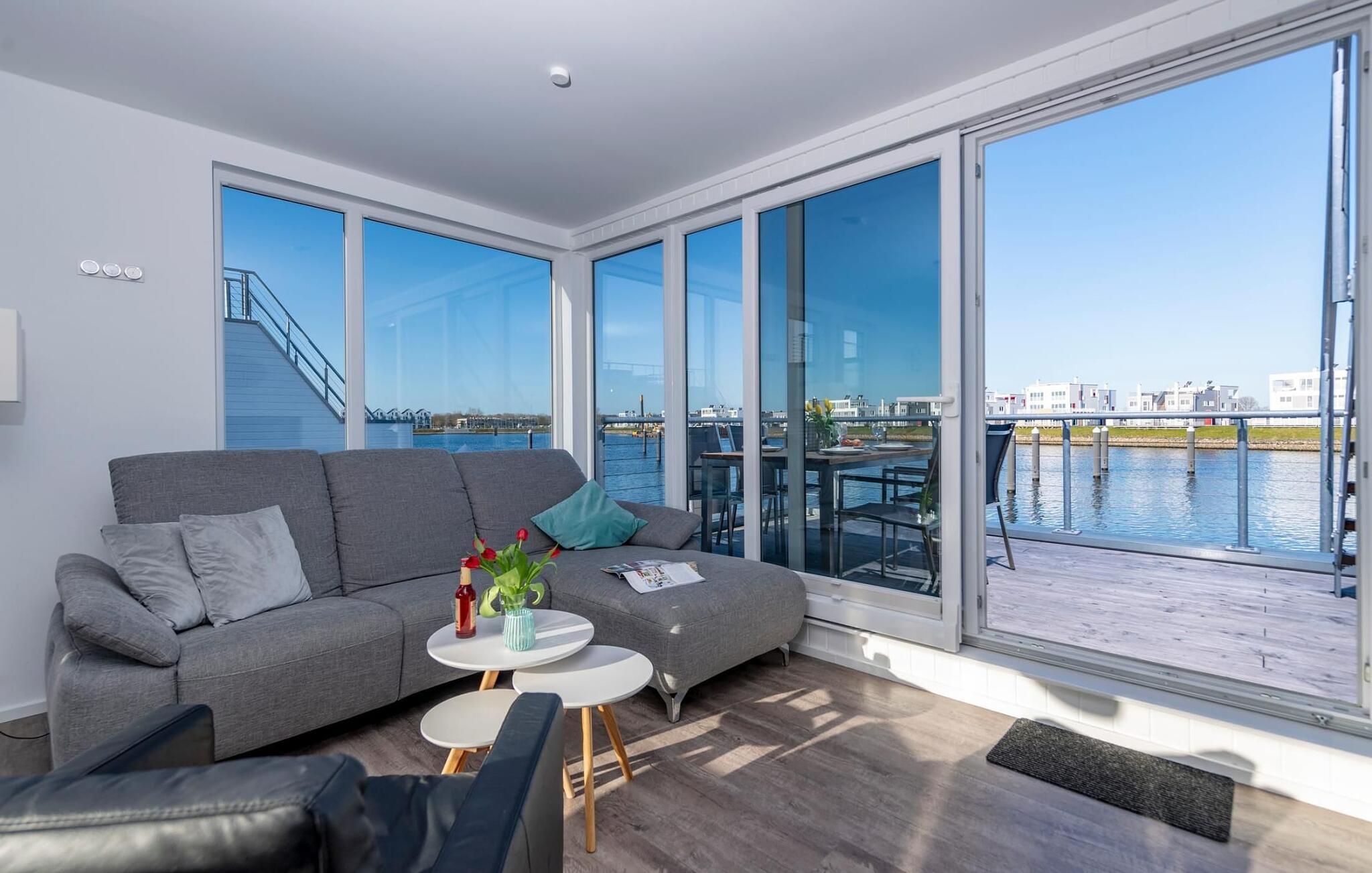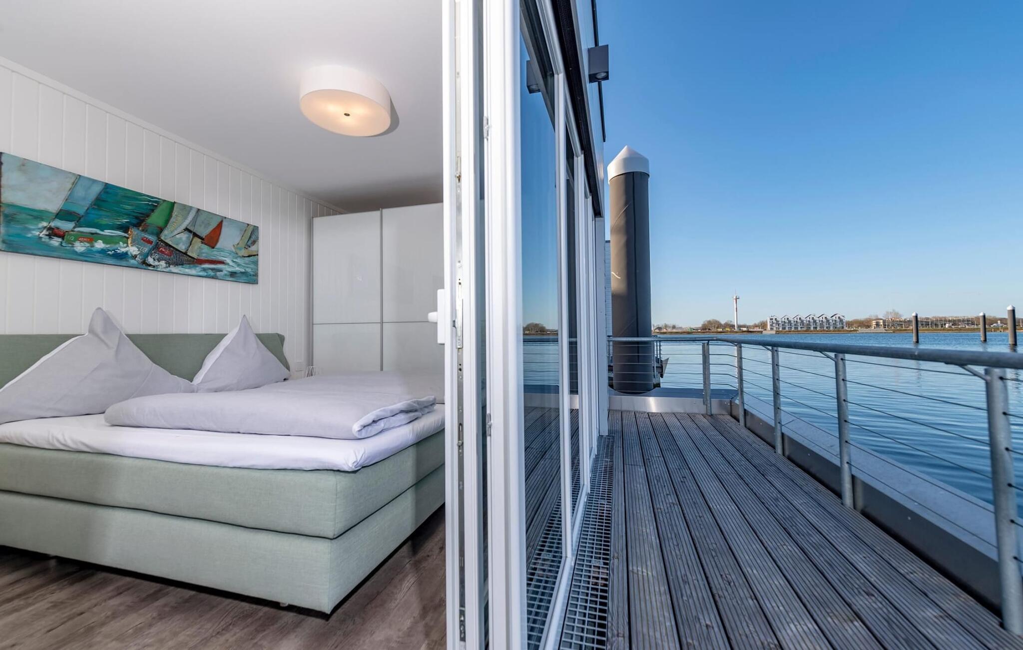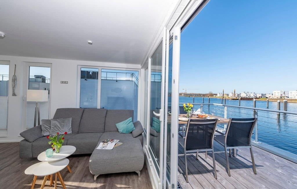 Erleben Sie Luxus und Meerblick im einzigartigen schwimmenden Ferienhaus Jule am OstseeResort Olpenitz.