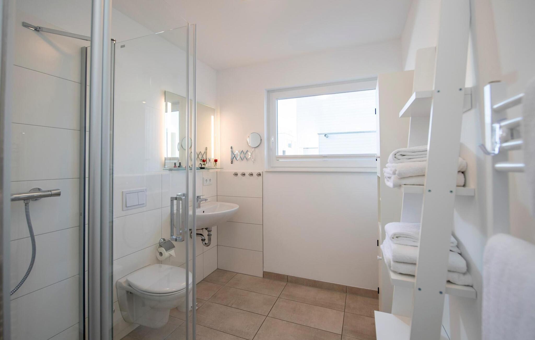 Natürlich fällt auch beim Saunieren oder Zähneputzen der Blick aufs Meer und vorbeischwimmende Schwäne.