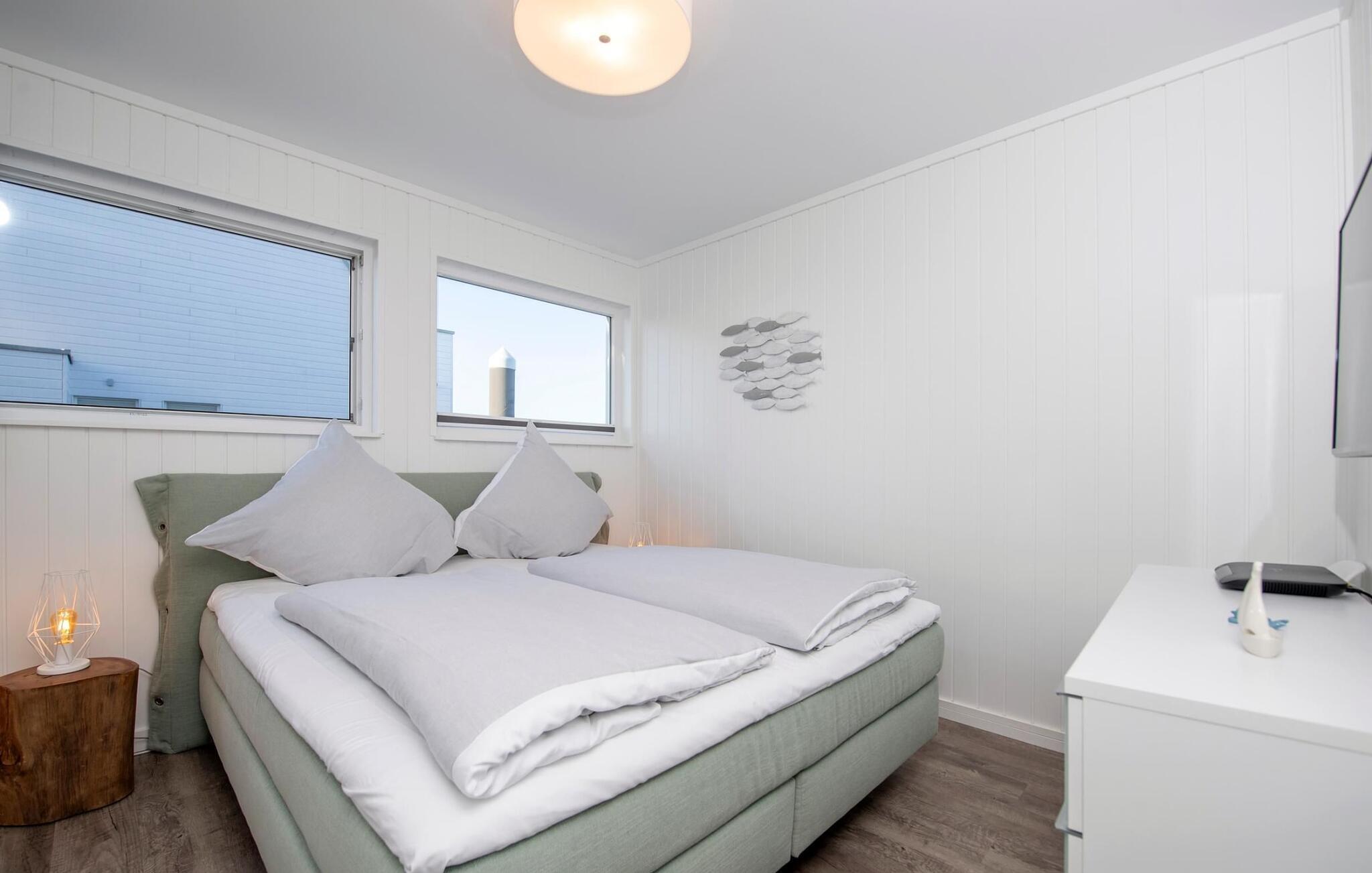 Der Ruhebereich des Hauses befindet sich im Erdgeschoss mit zwei Schlafzimmern, Badezimmer und Sauna. Das Hauptschlafzimmer punktet mit einer bodentiefen Panorama-Fensterfront, durch welche sich die atemberaubende Wasserkulisse genießen lässt, und einer angrenzenden umlaufenden Terrasse. Beide Schlafzimmer sind mit Doppelbetten ausgestattet, verfügen über Verdunklungsplissees und je einen HD-Fernseher.