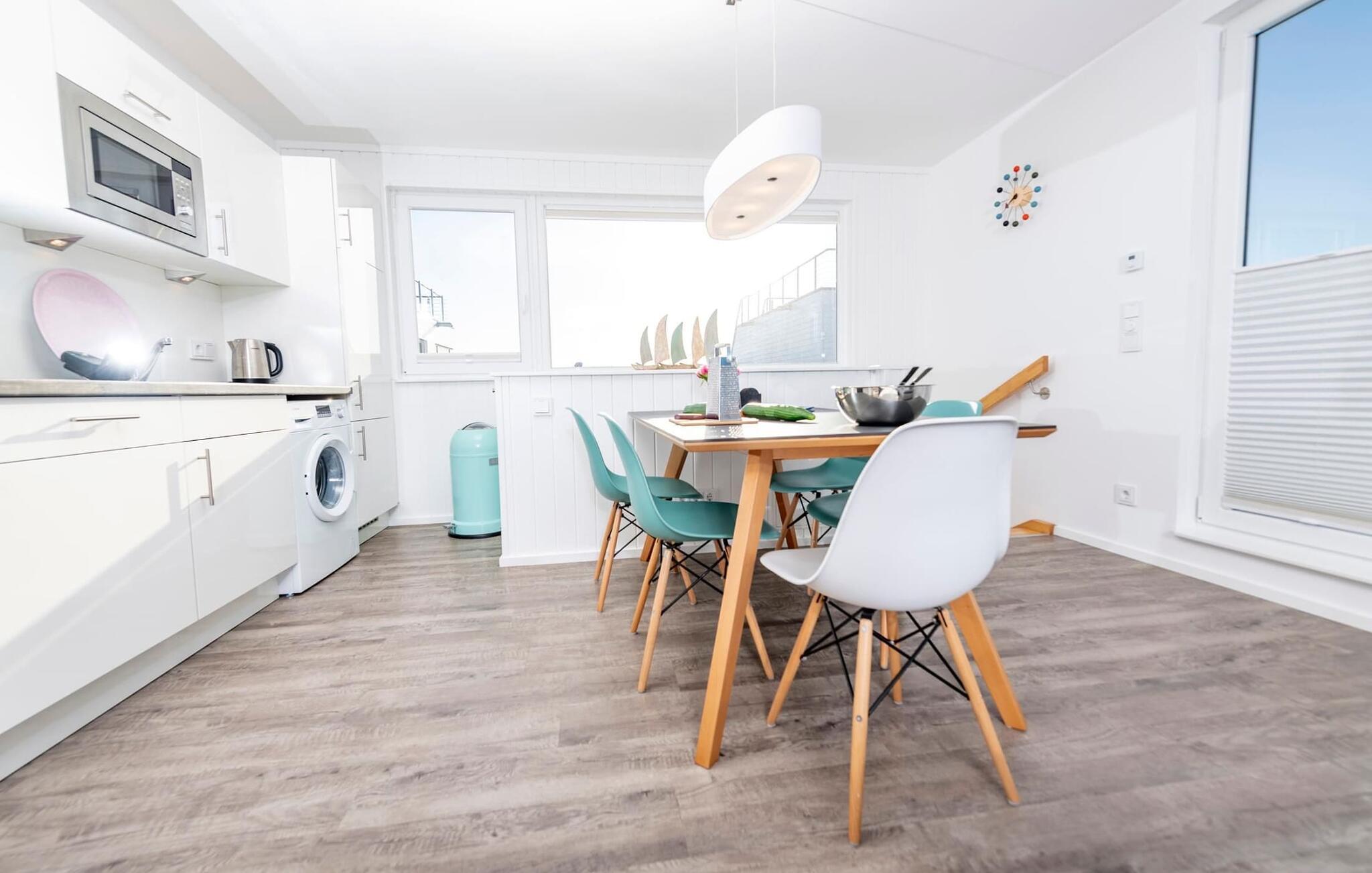 Das schwimmende Haus erstreckt sich über drei Ebenen. Im Obergeschoss befindet sich der offen gestaltete Wohn- und Essbereich mit Rundum-Wasserblick, voll ausgestatteter Wohnküche und angrenzender Terrasse. Von hier aus gelangt man auf die spektakuläre Dachterrasse mit Blick über den Segel- und Sportboothafen, die Schlei und deren Mündung in die Ostsee. Ausgestattet mit hochwertigen Gartenmöbeln und Weber Elektrogrill bieten die Terrassen pures Urlaubsfeeling und atemberaubende Sonnenuntergänge. Auf der Dachterrasse steht ein extragroßer, stufenlos verstellbarer Strandkorb (1,40 m Breite) zur Verfügung. In der Horizontalen lässt es sich hier auch bequem ein Nickerchen machen.