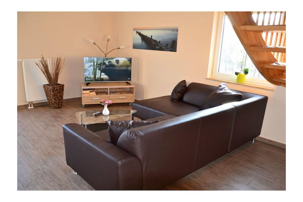 Seebad Juliusruh, 2. Etage, komfortable Ausstattung, ruhige Lage, 150 m zum Sandstrand (Ostsee), ca. 2000 m zum Hafen Breege Wohn- Essbereich mit gemütlicher Sofalandschaft, Balkonzugang, TV/ Sat (Flachbildschirm), moderne offene komplett ausgestattete Einbauküche mit 4- Plattenherd (Ceranfeld), Grill/ Mikrowellenkombination, Kühlschrank mit kleinem Gefrierfach und diversen Elektrogeräten, im OG offenes Schlafzimmer mit Doppelbett und Kleiderschrank und TV, komfortables Bad mit Dusche/ WC, Balkon zur Südseite mit Gartenmöbeln “Strandurlaub pur - moderne FeWo nahe dem Ostseestrand\" Fahrstuhl im Objekt, Blick vom Strand bis nach Kap Arkona, Fahrradabstellmöglichkeit vorhanden (Keller), Bügeleisen und Bügelbrett, Nichtraucherwohnung. Ca. 2 km entfernt in Altenkirchen finden Sie einen Netto, das Kaufhaus „Stolz“, Edeka und einen Getränkemarkt. Restaurants und Radverleih sind in der Nähe. Vom ca. 2 km entfernten Hafen sind Ausflugsmöglichkeiten per Schiff zur Insel Hiddensee und zu den Störtebeker-Festspielen möglich, Segelschule, optimale Rad- und Wandermöglichkeiten. Eigener Tiefgaragenstellplatz am Objekt, Haustiere nach Absprache (Gebühr Euro 5,-/ pro Haustier/ pro Nacht)